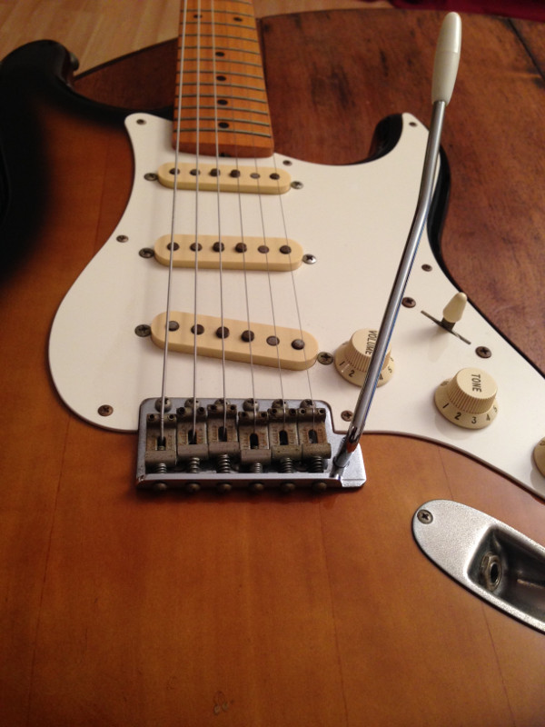 En soit ce n'est pas trés grave, mais cela incite à changer le bloc vibrato ( 200 Euros environ), ce qui est un excellent "upgrade" si on y met un bloc acier type Callahan...Mais le prix de vente doit tenir compte du fait que la barre, pas de vis et le bloc sont quand même endommagés empêchant un jeu correcte avec vibrato engagé donc... (sans vibrato, pas de probléme...).