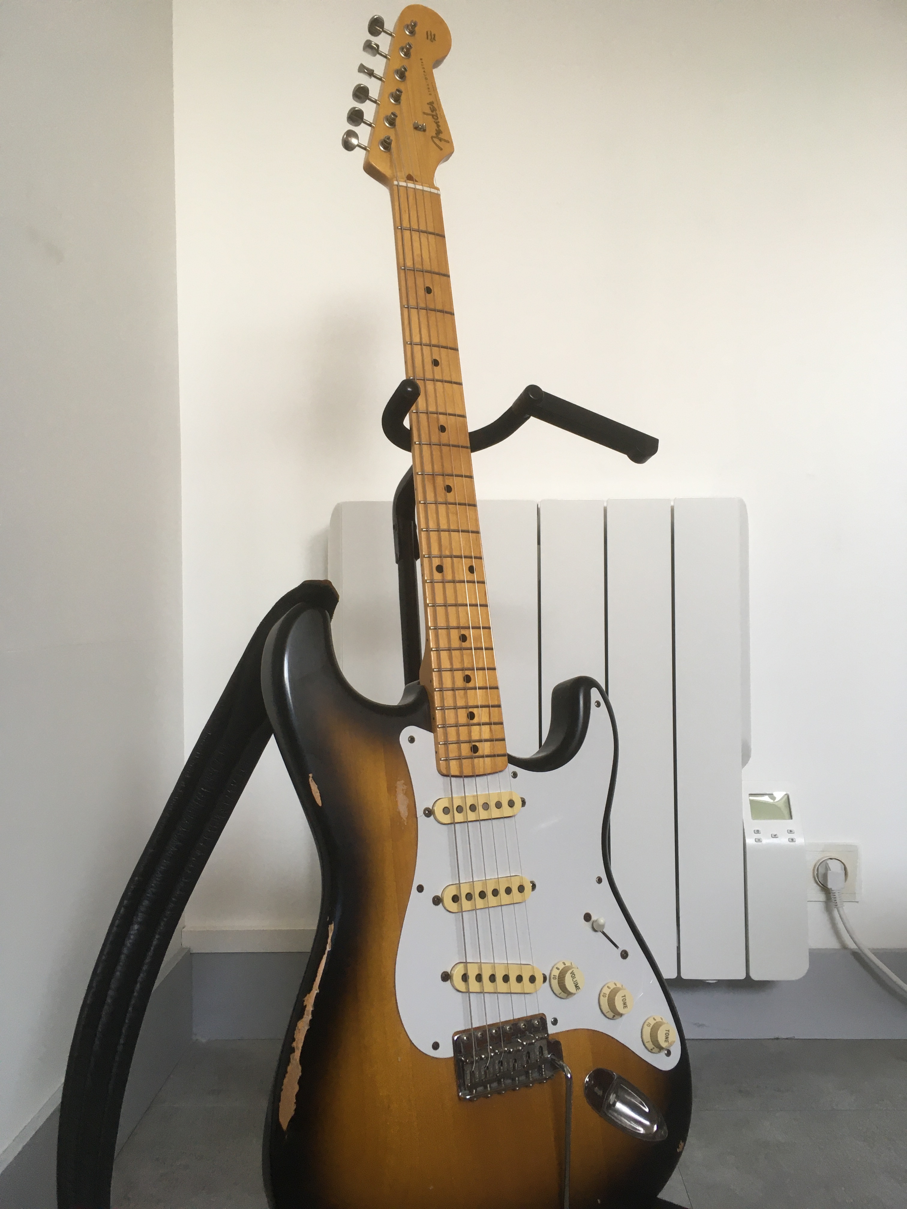 Donc à l’origine c’était une Std Japan datant de 89 avec un corps bleu que j’ai acheté il y a 22ans moins de 2000fr. Je me suis vite lassé de cette couleur et Up 1er changement avec un corps ST57-70 ?T. Par la suite, les micros d’origine ont été remplacés par des Texas Spécial. Il y a quelques semaines maintenant j’ai remplacé le manche dont les frettes étaient quasi inexistantes suite à replanif puis 15ans de jeux, j’avais l’impression de jouer une fretless.