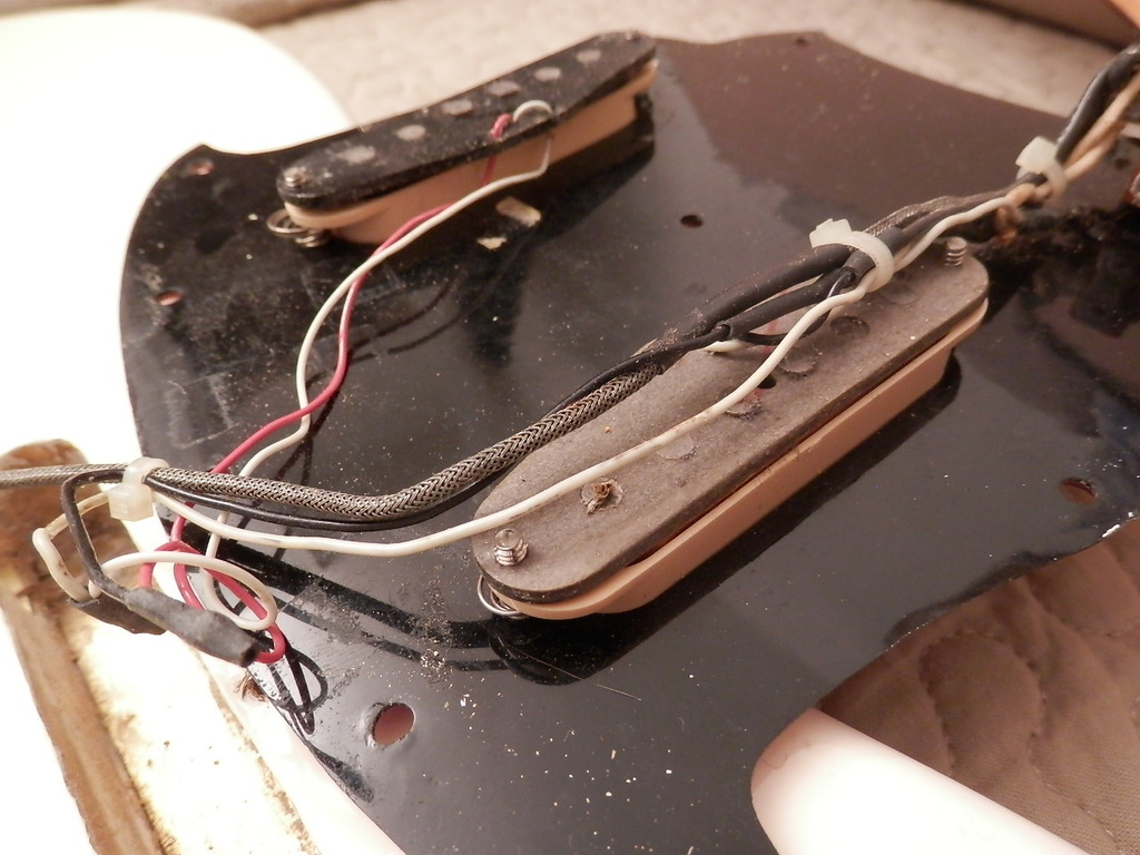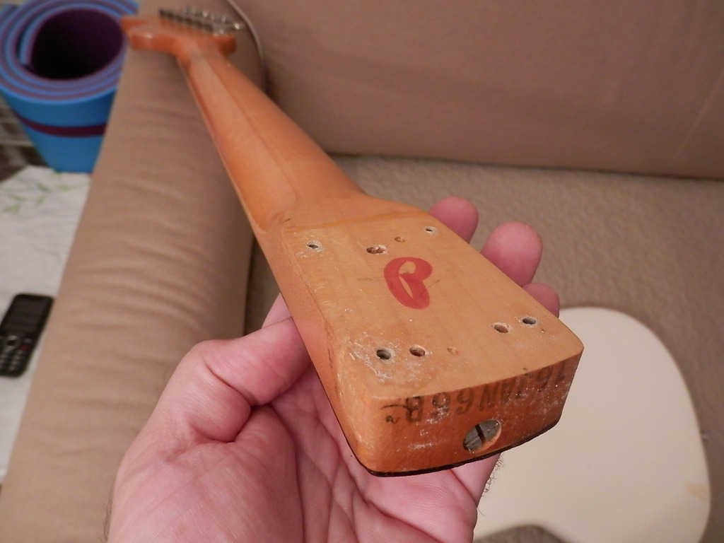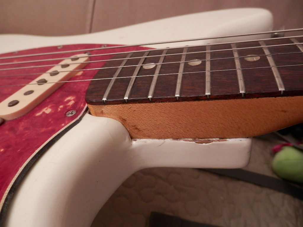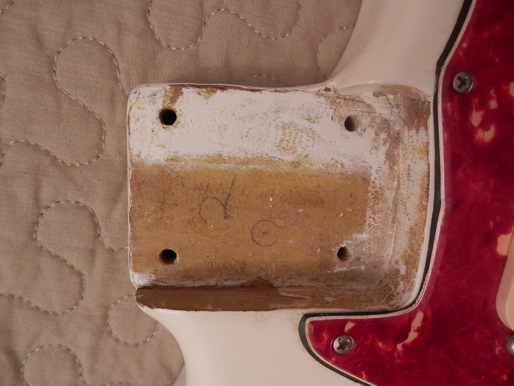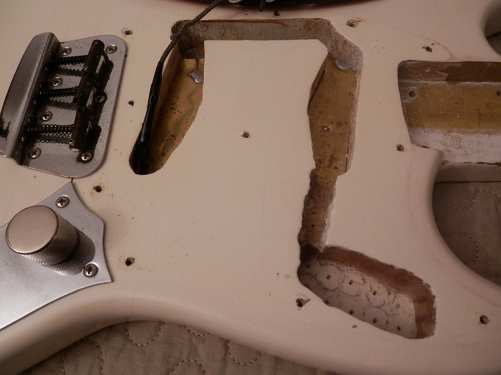 Je suis assez perplexe au sujet du corps, il a été visiblement repeint après la modifications de l'electronique (traces de peintures dans la nouvelle cavité du switch), également les trous ne sont pas tout à fait en face des trous du pickguard...