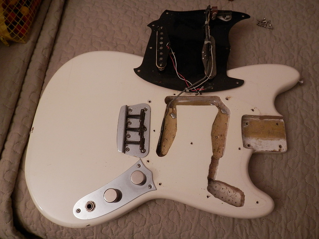 J'aimerais savoir ce qui semble d'origine, je me demande notamment la provenance du corps, micros et électronique. J'aimerais aussi savoir à combien les spécialistes l'estimerait. J'hésites à la faire revoir ou la revendre en l'état. Je l'ai acquise un peu sur un coup de tête alors que je cherchais une Mustang.