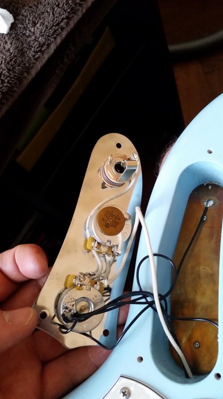 La raison est que je voulais conserver des micros aux polarités opposées pour l'effet de réduction des parasites une fois les deux micros ensemble. J'adore l' Antiquity Surfer Strat sur ma gratte !! Et puis les deux fonctionnent parfaitement ensemble !