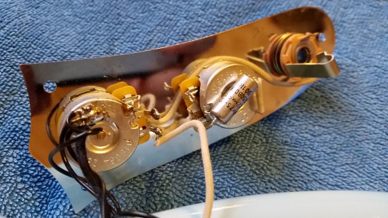 2/ J'ai remplacé le condensateur de tonalité (pourtant un NOS "vintage correct") par un que j'avais commandé en double pour une Trussart Steelcaster, c'est un mylar K73-22 Russe 0.022uF, bien plus musical, moins sombre, sourd, et plus chantant tonalité à 0.
