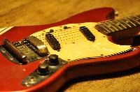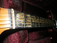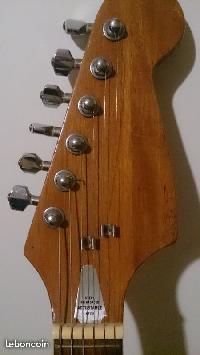 Je lui ai remis un PG perloïd de 65 trouvé sur ebay, 2 ressorts neufs et 2 pivots de 65 pour le vibrato qui avait été bloqué et surtout je suis passé par la case luthier (Fred Kopo au nord de Rennes) pour la reprise discrète du vernis au dos du manche qui était injouable, la planification de la touche et le refrettage. 650€ de frais en tout dont 550 de luthier.