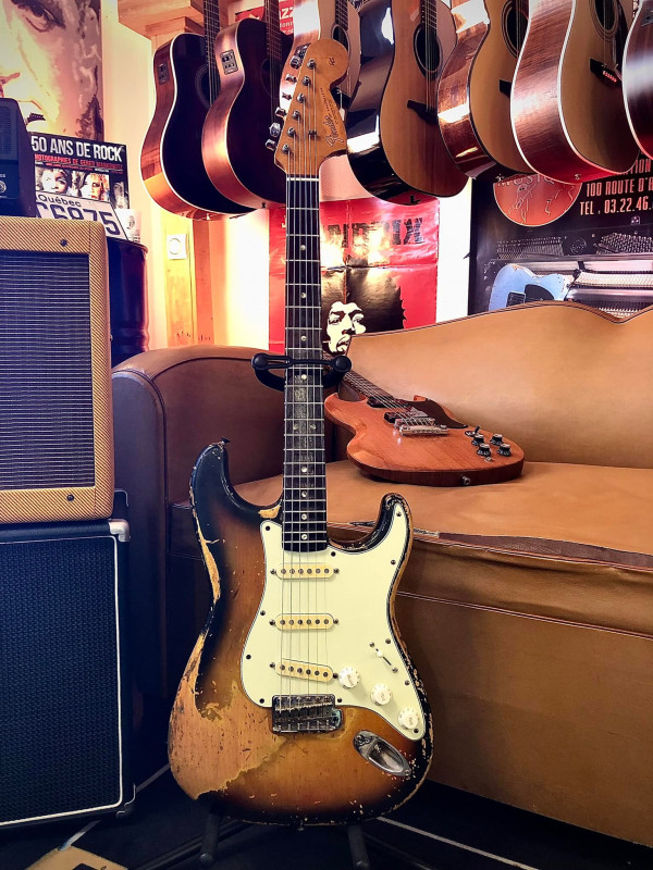 En ce qui me concerne, dans un premier temps je me concentrerais sur la remettre en état de jeu, donc refaire le sillet, les frets, restaurer la touche si besoin et je tenterais effectivement de monter un autre tremolo juste pour tester et voir si ça amène un plus (un Gotoh vintage tremolo en finition aged pourquoi pas?). Cela dit si le bloc tremolo a l'air correct je commencerais juste par tester d'autres pontets.