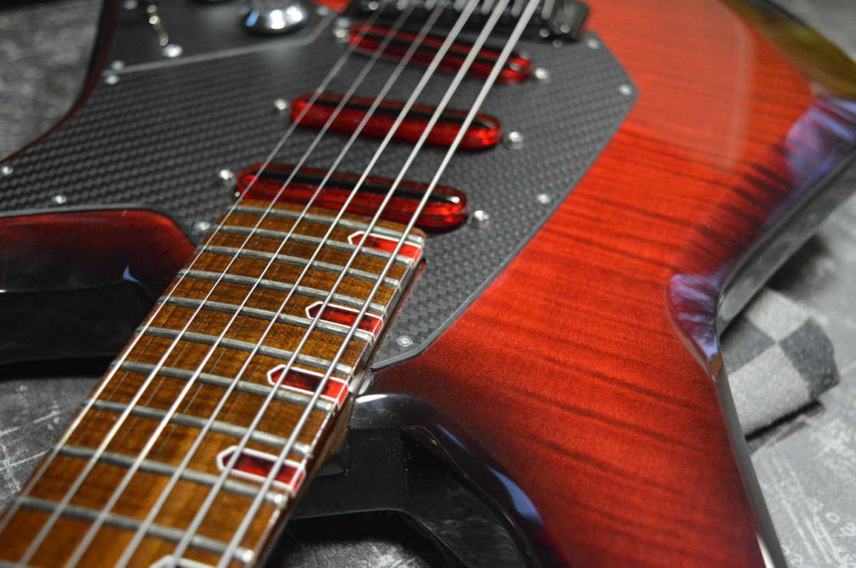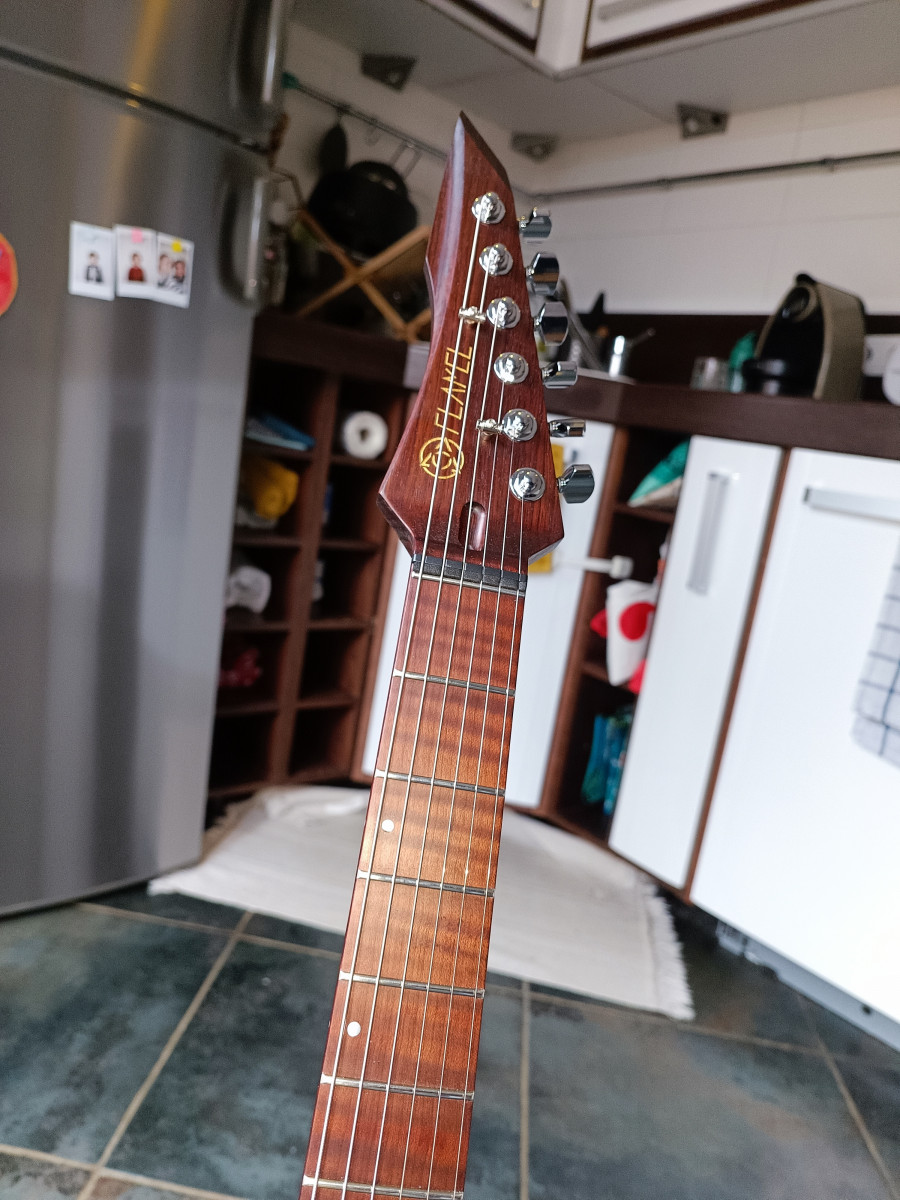 - un manche très fin qui tient bien en main, large comme il faut (en C, sensiblement le même que celui d'une Ibanez prestige avec un poil plus de rondeur). Une vraie autoroute. Le seul aspect inconnu pour moi était la sensation du korina torréfié. Ca donne l'impression d'avoir un manche peu dense c'est assez étrange, faut que je me familiarise (mais c'est pas désagréable,). La touche est magnifique en érable torréfié flammée, ca rend vraiment super.
