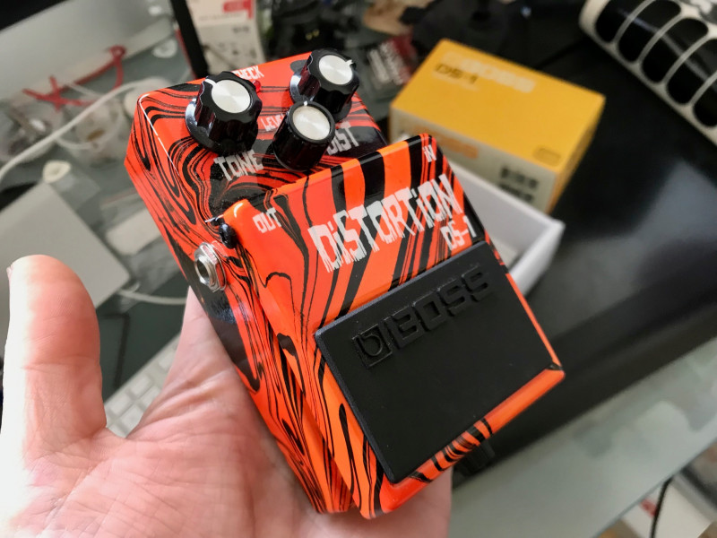 Ah la DS1... Du coup je suis allé au grenier fouiller dans mon carton à pédales. J'ai bien une DS1 mais le orange est plus foncé que celui de la guitare...