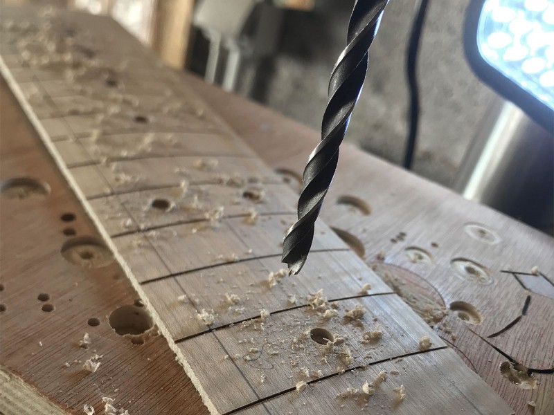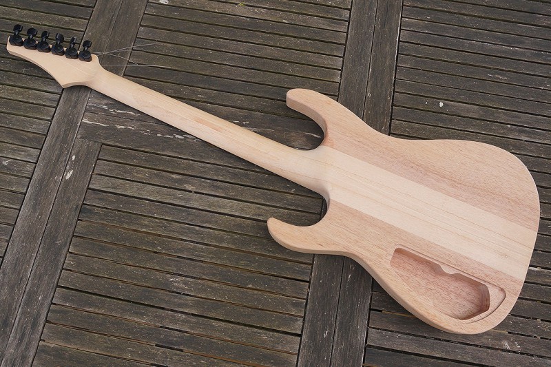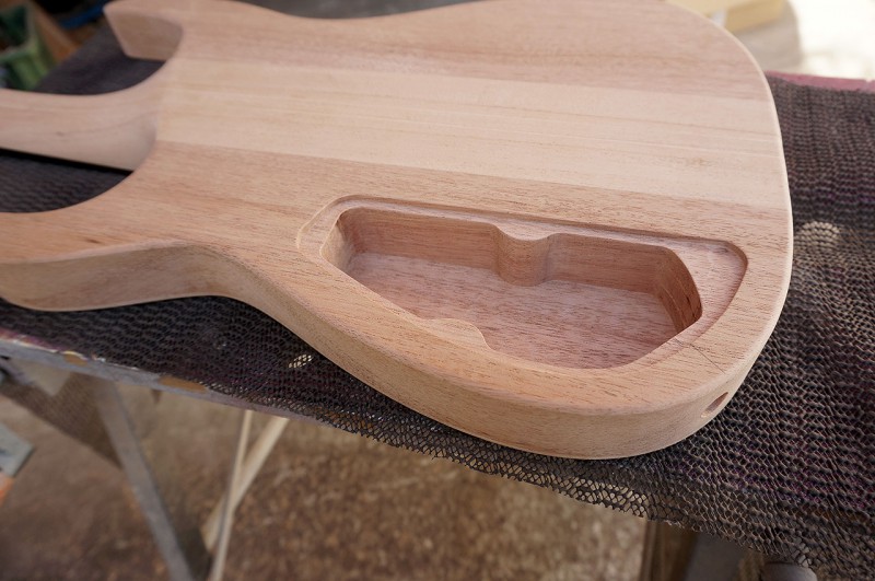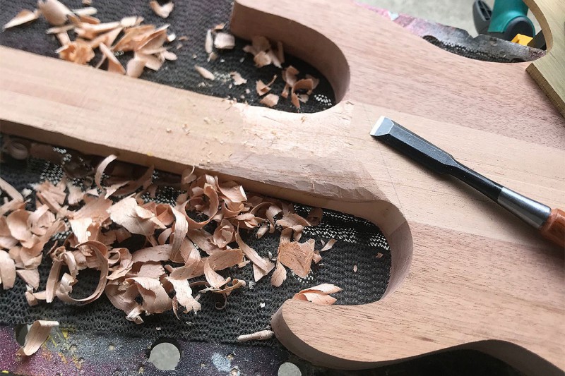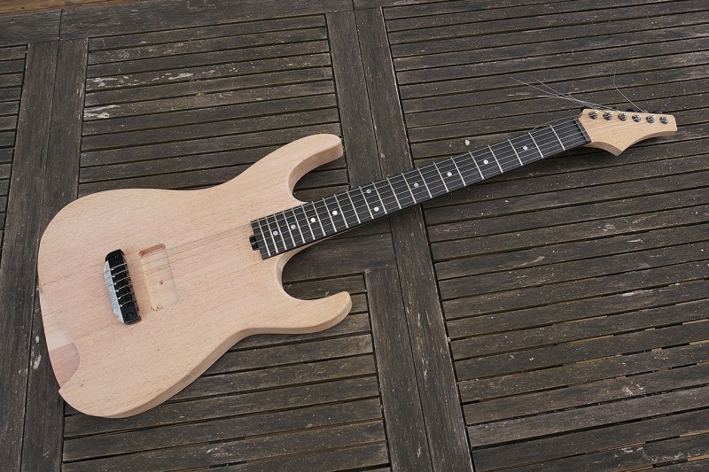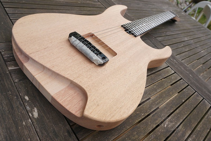 Positionnement du Wraparound Gotoh. Défonce pour le micro (DiMarzio Tone Zone P-90). Défonce de la vague arrière. Frettage (jumbo inox). Mise en place du sillet graph tech. Pose de cordes de test.
