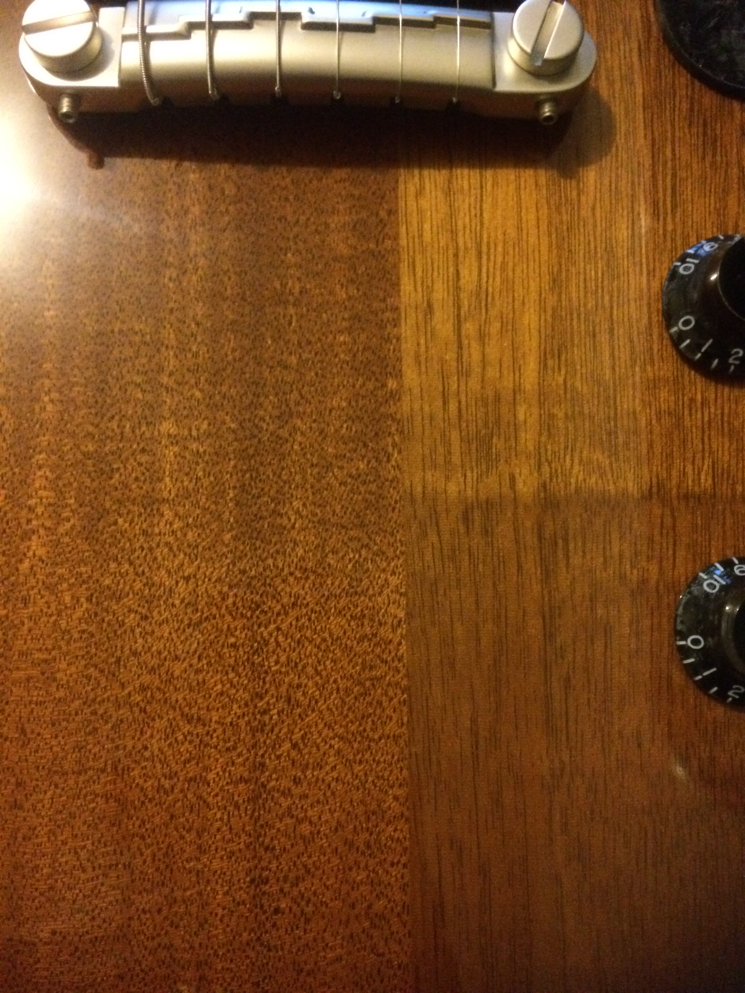 En gros, en l'inspectant de plus prêt, il y avait, en plus de l'assemblage douteux, un défaut dans le vernis sur une des tranches de la guitare (très certainement une bulle qui a pétée au séchage laissant un "trou" dans le vernis).