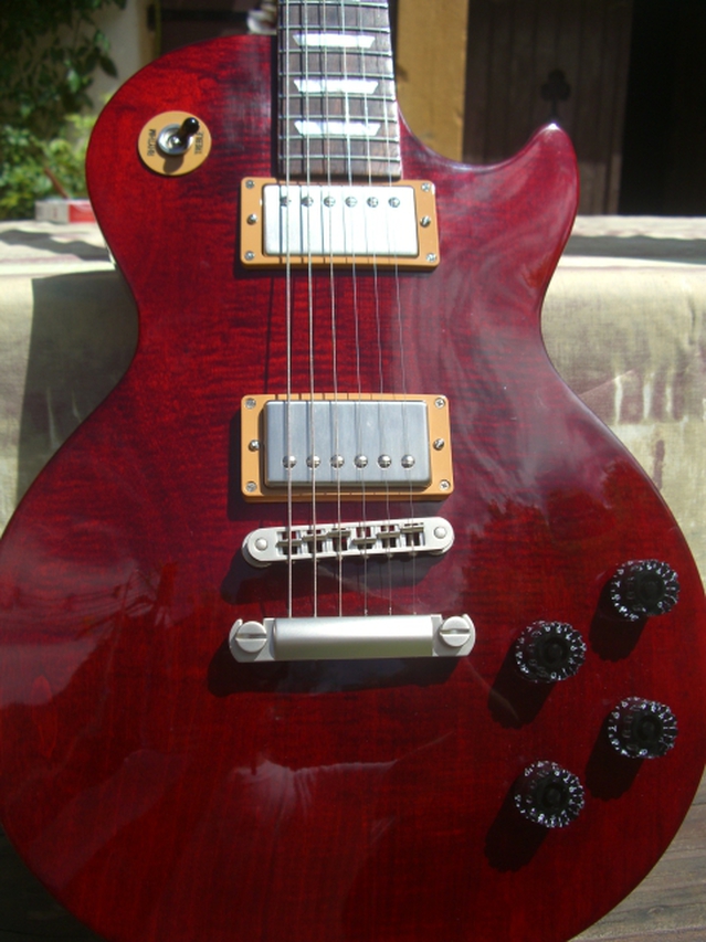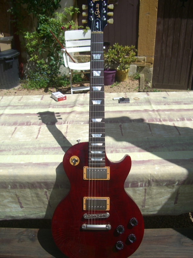 Mes proches se sont cotisés pour mon anniversaire et je me suis acheté une LP Studio "Sprint Run" (traduction approximative de "rétropédalage"), série limitée sans GForce, avec largeur de manche classique, avec quand même le tag sur la tête et l'autocollant du vieux et sillet-frette zéro métallique.