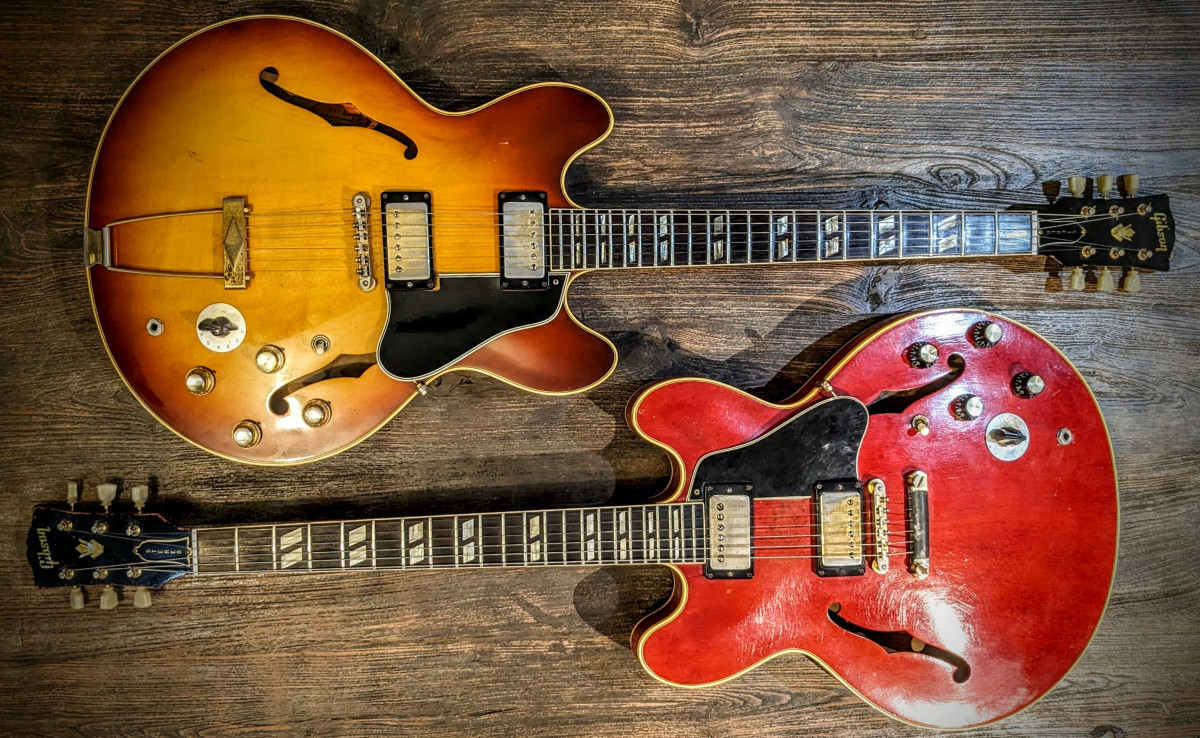 Modèle de transition assez rare d'Epi Coronet de 1960 mixant le Slab body mais en cherry des modèles 58-59 (qui est lui noir) à single coils New York et le P90 des modèles 60's avec corps fin.