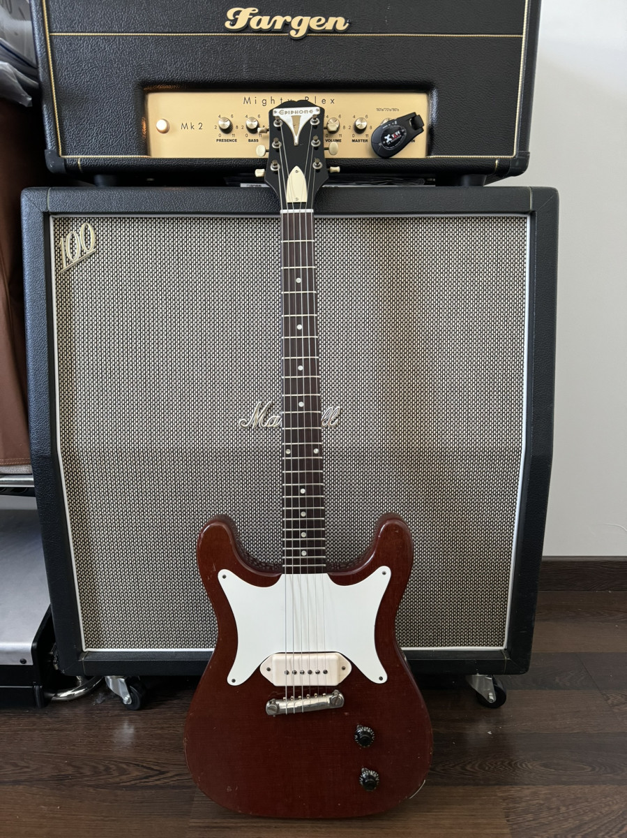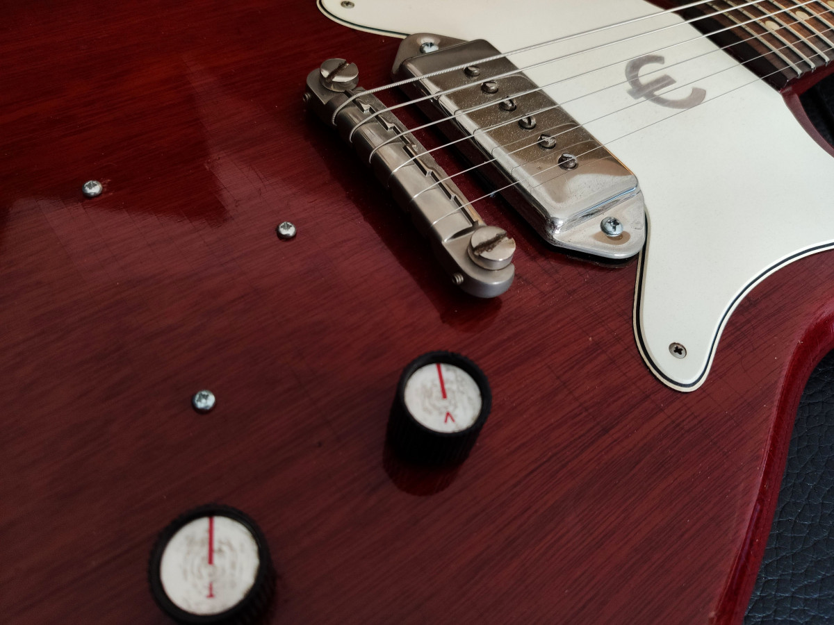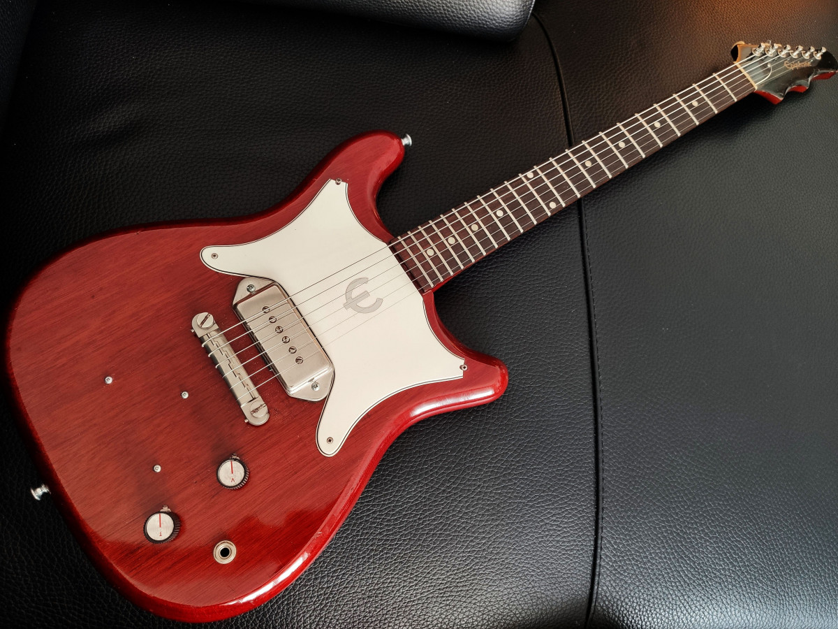 Modèle de transition assez rare d'Epi Coronet de 1960 mixant le Slab body mais en cherry des modèles 58-59 (qui est lui noir) à single coils New York et le P90 des modèles 60's avec corps fin.