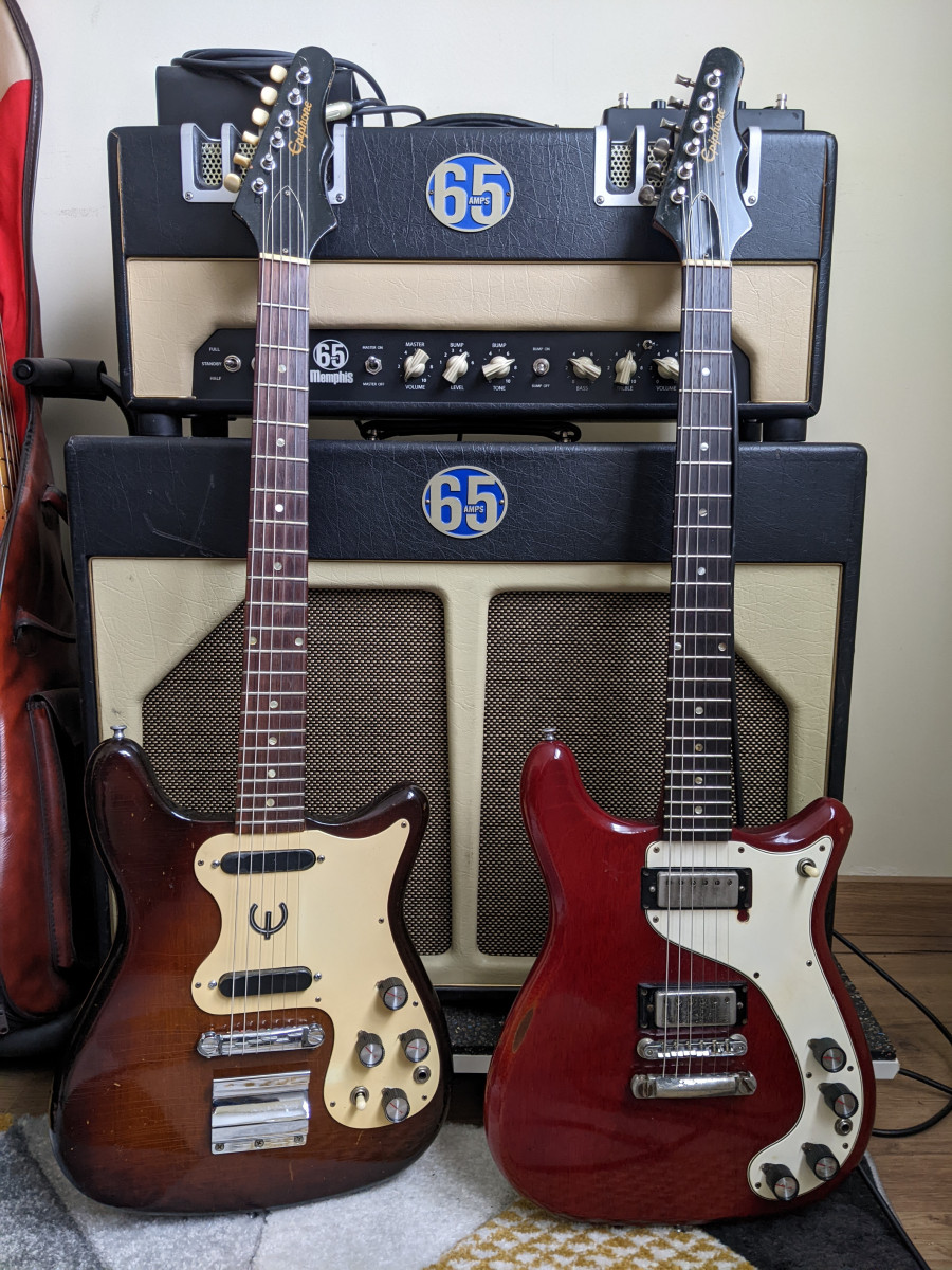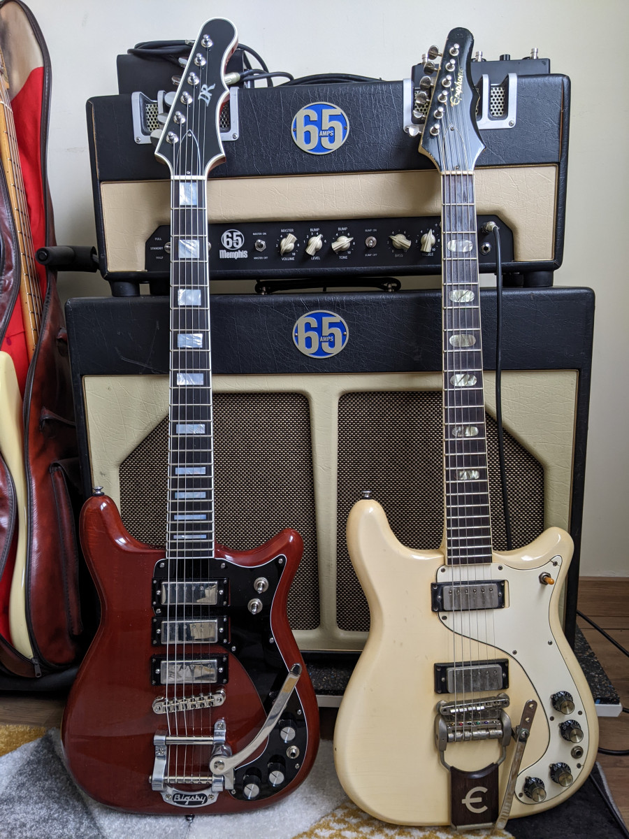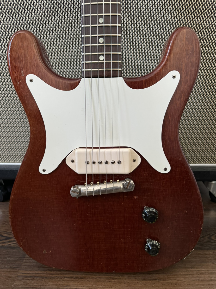 Modèle de transition assez rare d'Epi Coronet de 1960 mixant le Slab body mais en cherry des modèles 58-59 (qui est lui noir) à single coils New York et le P90 des modèles 60's avec corps fin.