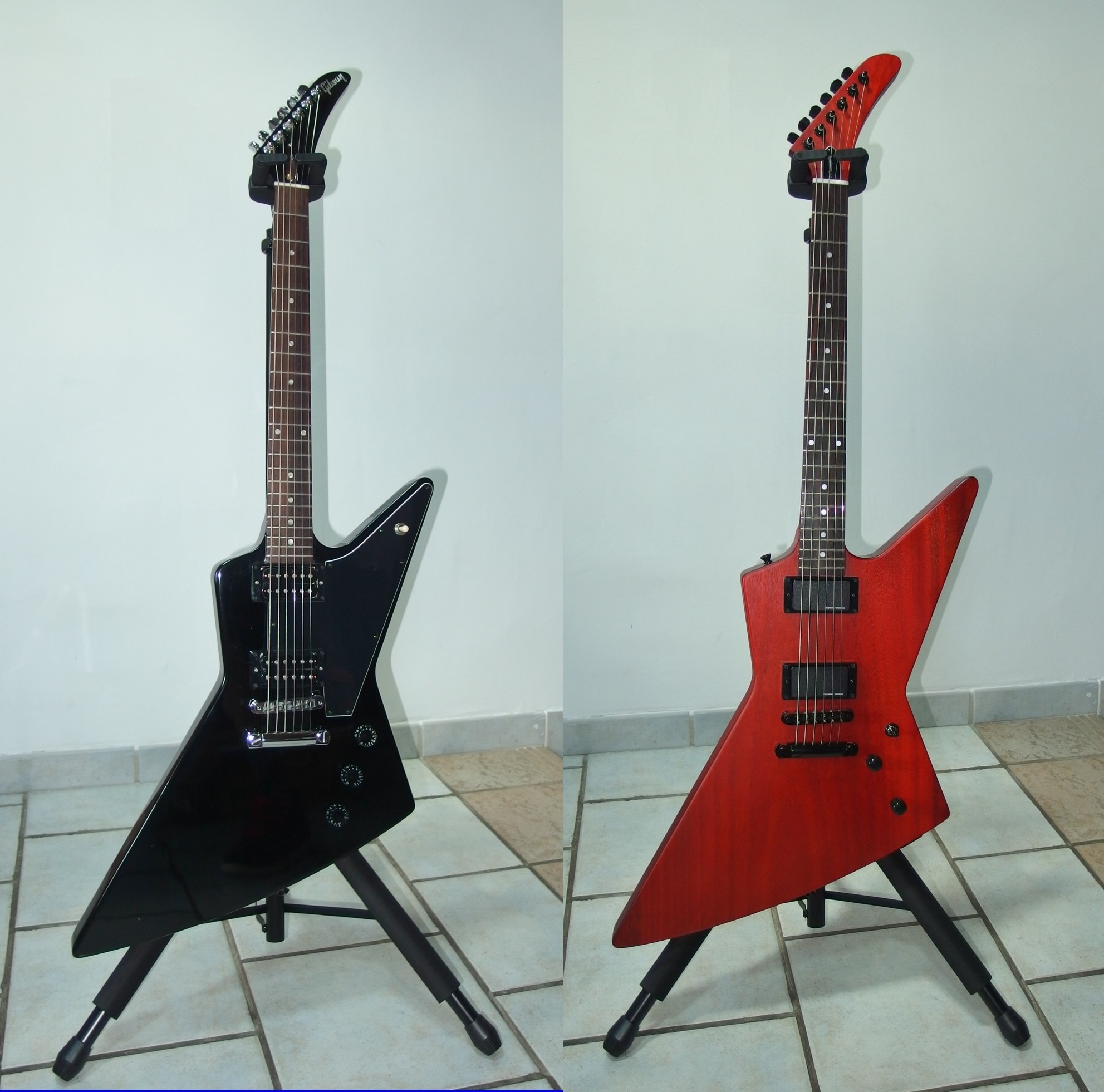 Je m'interresse aux Explorer, car j'ai une Les Paul en guitare principale. J'ai une guitare forme strat (une Cheri) bas/moyen de gamme et j'ai une King V de Jackson que je mets actuellement en vente, car je ne joue plus que chez moi et donc assis, et la King V pour jouer assis, pas génial on va dire !