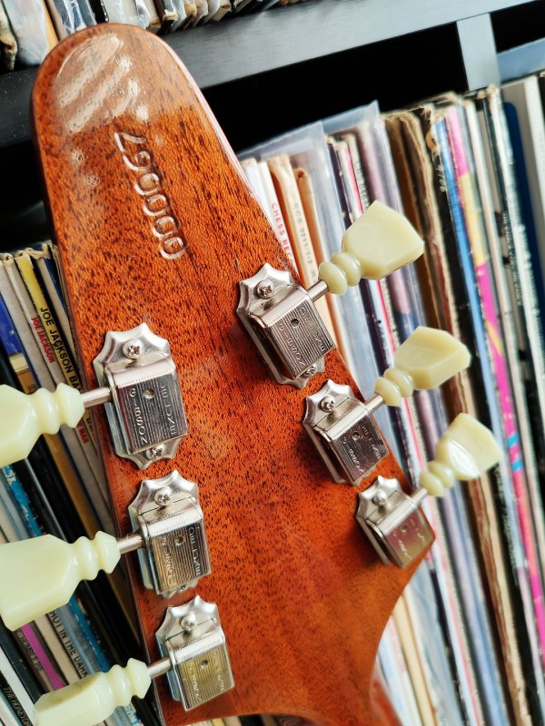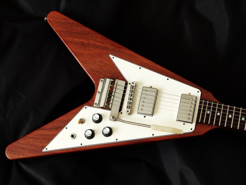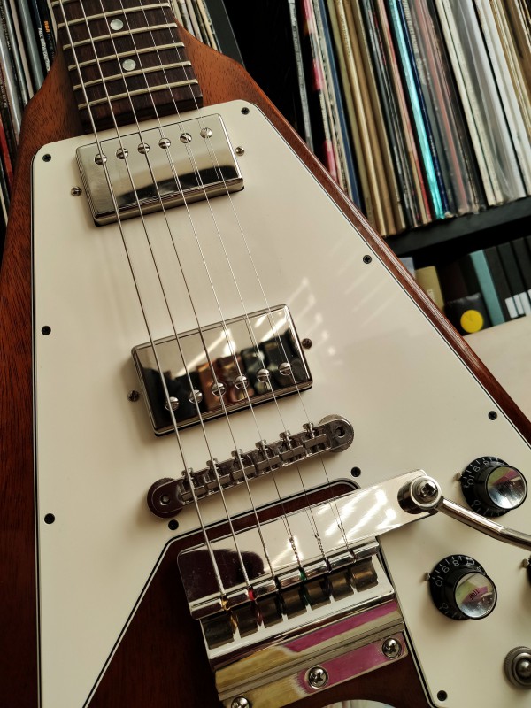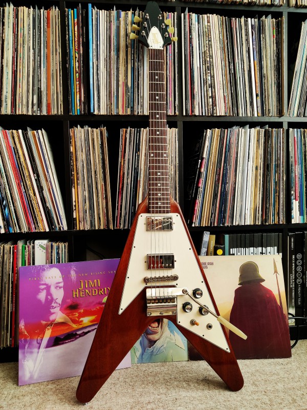 C'est en fait ma première "vraie" Flying V Gibson (j'ai une Duesenberg, des Epi, ma custom junior de luthier mais pas de Gibby). J'en ai joué dans le passé, prêtées par des amis, mais à une époque où je n'étais pas confortable avec.