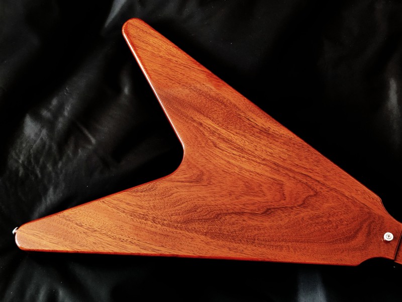 Deuxième surprise: le manche. C'est un bon manche costaud comme je les aime, et extrêmement confortable. En position debout, elle est parfaitement bien équilibrée (pas toujours le cas avec les V qui ont l'attache au bout de la corne) et extrêmement jouissive à jouer.