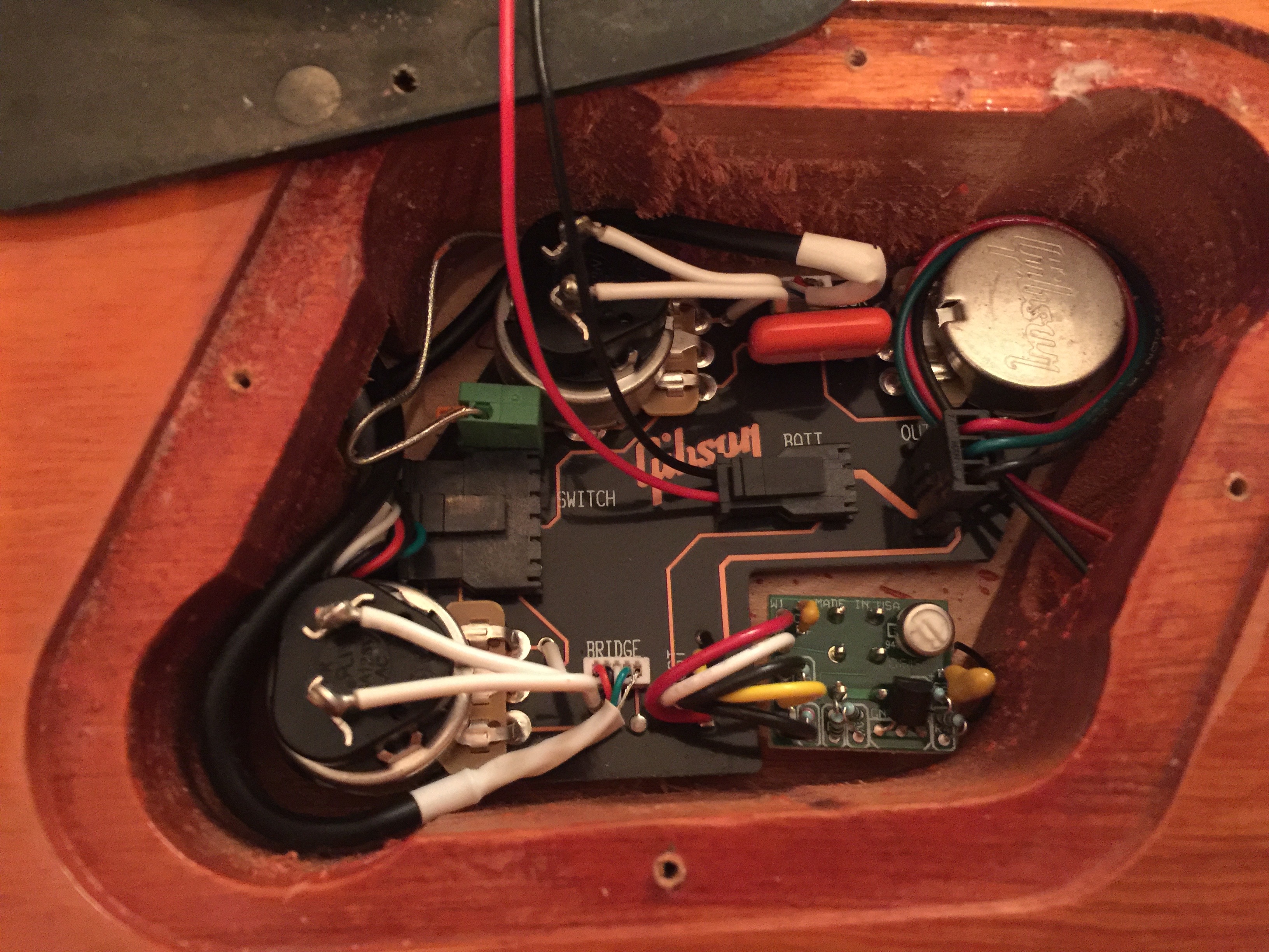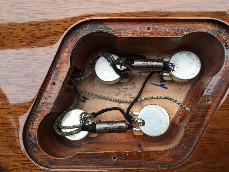 Je ne mers quasiment pas de ce boost et étant inesthétique, je songe à le virer pour le remplacer par un potard de tonalité, histoire d'en avoir un pour chaque micro au lieu d'un qui s'applique aux 2 (et au passage, refaire un câblage à l'ancienne).