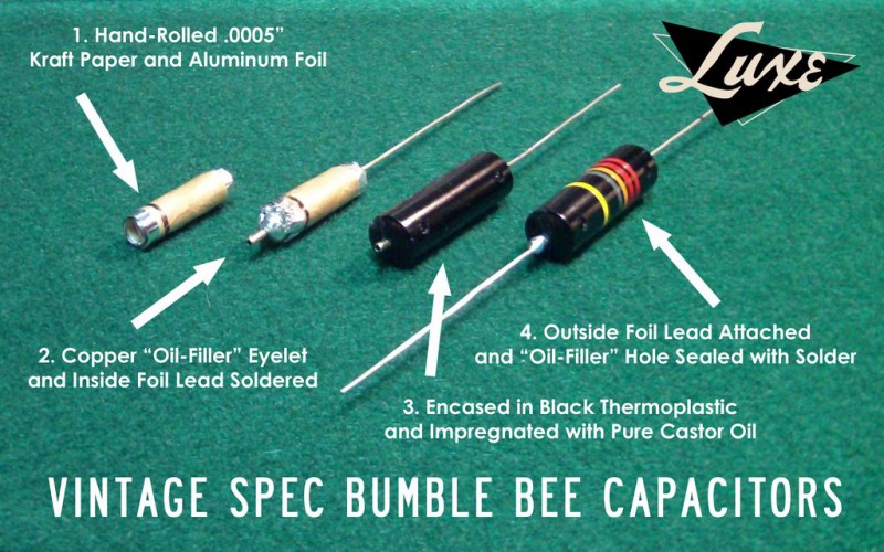 Pour les valeurs, sur une Les Paul il y a en général du 0.022µF. La tension importe peu, tu peux mettre des capas tenant entre 50 et 1000V ça changera rien au niveau électrique et au niveau du son. Par contre, ça peut avoir une influence sur la taille.