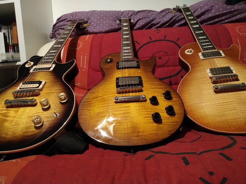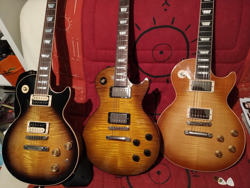 J'ai une lespaul special, un modèle que je n'ai pas vraiment réussi à cataloguer, je l'avais acheté au meilleur vendeur de gibson en France en 2007 qui l'avait reçu en cadeau de gibson/France. Sa particularité est qu'elle a deux humbuckers, je crois que c'est des burstbrucker et elle a le pickguard classique des lespaul spècial. Elle sonne super et complémente parfaitement ma lespaul classic reissue 1957 qui a 2 P90. je n'ai vu que des photos de lespaul special avec des P90, la mienne, nada, pas retrouvé de traces de cette guitare.