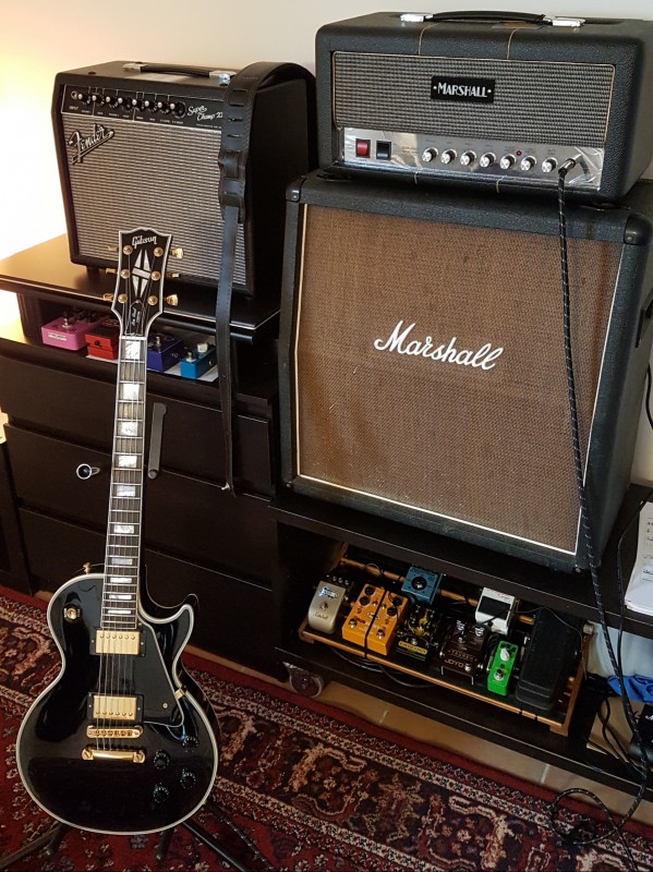 Il y a 2 mois je me suis payé pour mes 45 ans la dernière gratte dont je rêvais depuis toujours, une Les Paul Custom, j'ai trouvé une Silverburst de 2011 en état plus que neuve chez un collègue de taf pour 2000 euros, elle à manche 50 que je suis entrain d'apprivoiser, après 6/7 répète que commence à m'y faire......truc cool c'est qu'elle fait "que" 4.2 kg celle là !