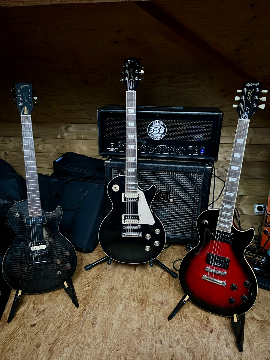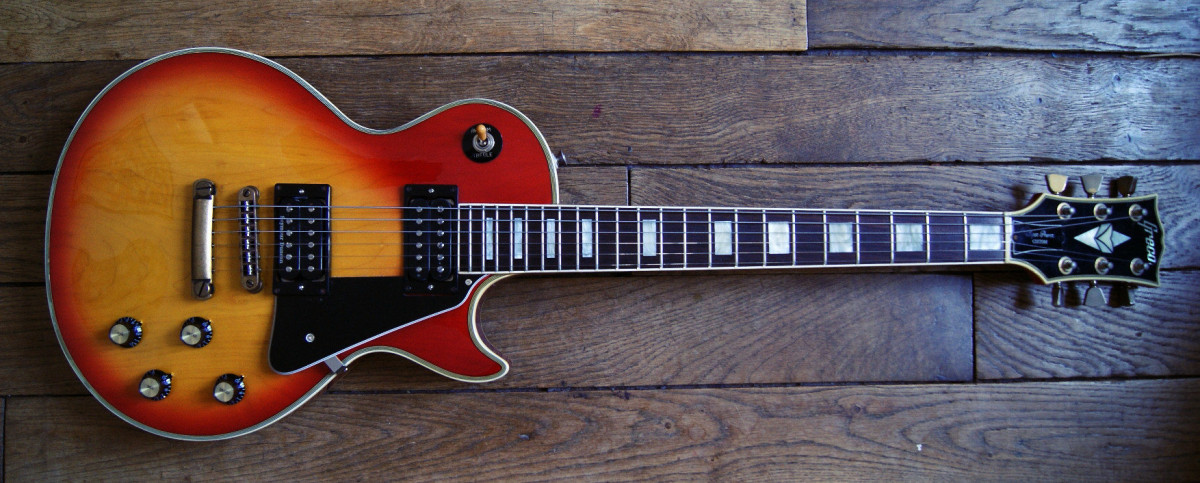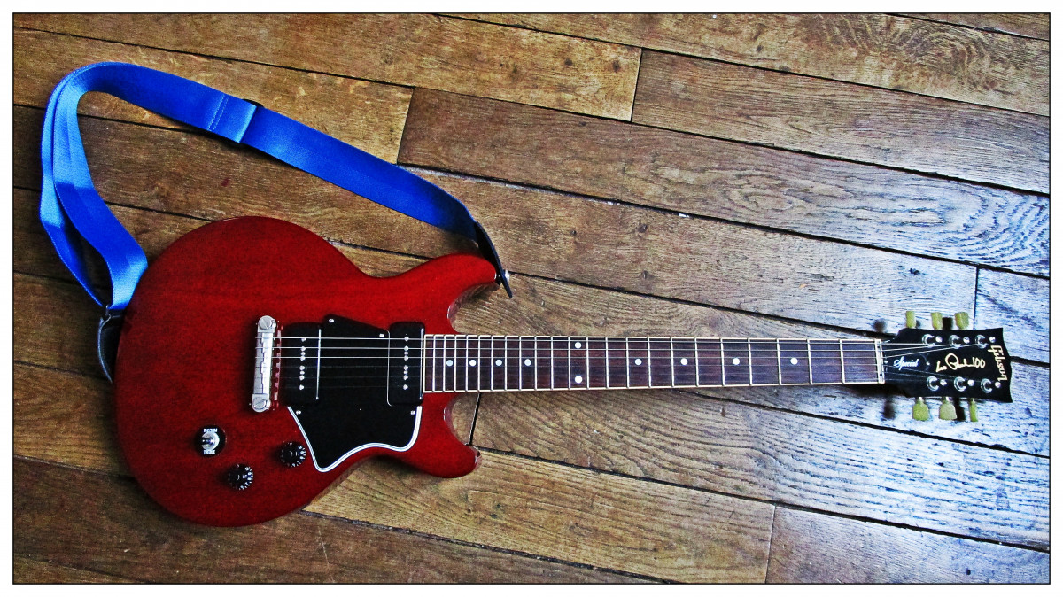 Super légère (autant que mes LP junior d'époque!), un bon gros manche (pas du tout 60s pour le coup!) mais j'aime ça, elle sonne super ... sauf que quand je l'ai eue, le micro manche déconnait. Je n'avais pas envie de la retourner car elle me plaisait énormément et pas moyen d'en retrouver une identique, donc j'ai remplacé ce micro par un Monty P90 (évidemment, on n'en trouve pas avec des vis dorées, donc on a récupéré les vis du micro d'origine) et le résultat est fantastique, ce micro chante littéralement!