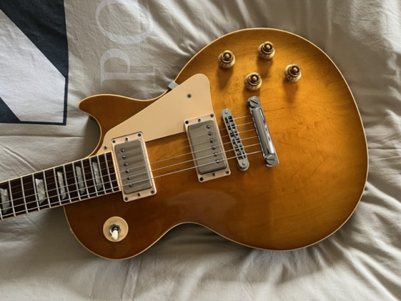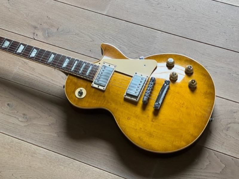 Comme j’ai vu que d’autres l’ont fait, J’ai envoyé le numéro de série et des photos chez Gibson. Ils confirment que c’est un honey burst plain top, mais que en fonction des lots de bois, il se peut que parfois certains plain top peuvent « looking a bit figured too » comme celui-là. Donc ce serait du plain top avec un poil de pommelé et un peu de moucheté. Des LP standard, standard plus et custom ont été disponibles avec ce lot de bois.