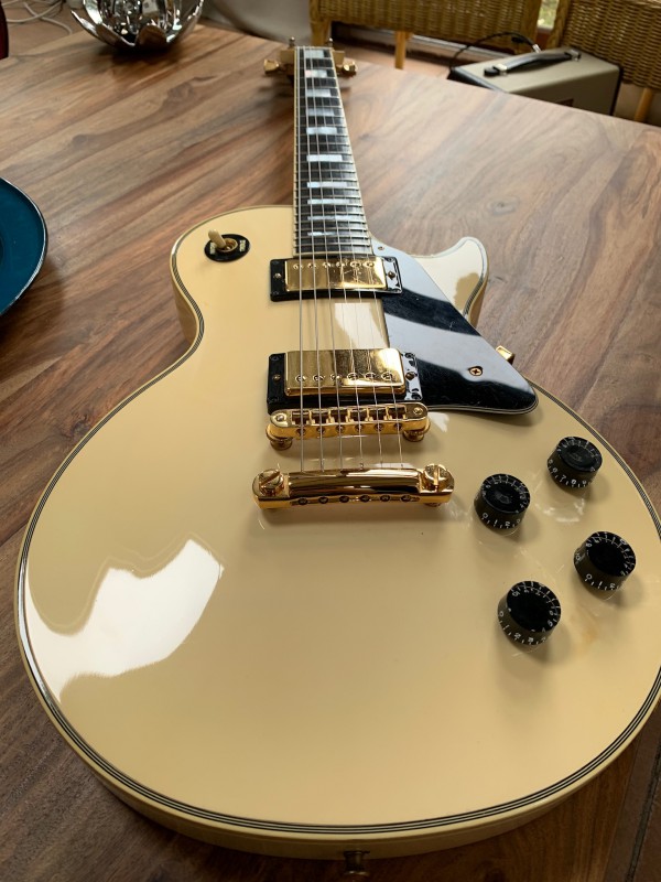 C’est donc une alpine white devenue crème, de 1987. C’est une première main, je me suis saigné à l’époque. Récemment je l’ai fait régler, fait mettre un pearly gates en neck et un Jeff Beck en bridge, c’est comme si c’était une nouvelle guitare pour moi. Ça sonne vraiment mieux à mon goût que les micros originaux que j’ai toujours trouvé trop baveux ou criard. Quel son crémeux, chaud et pourtant présent, je n’en reviens pas. Le sustain aussi !