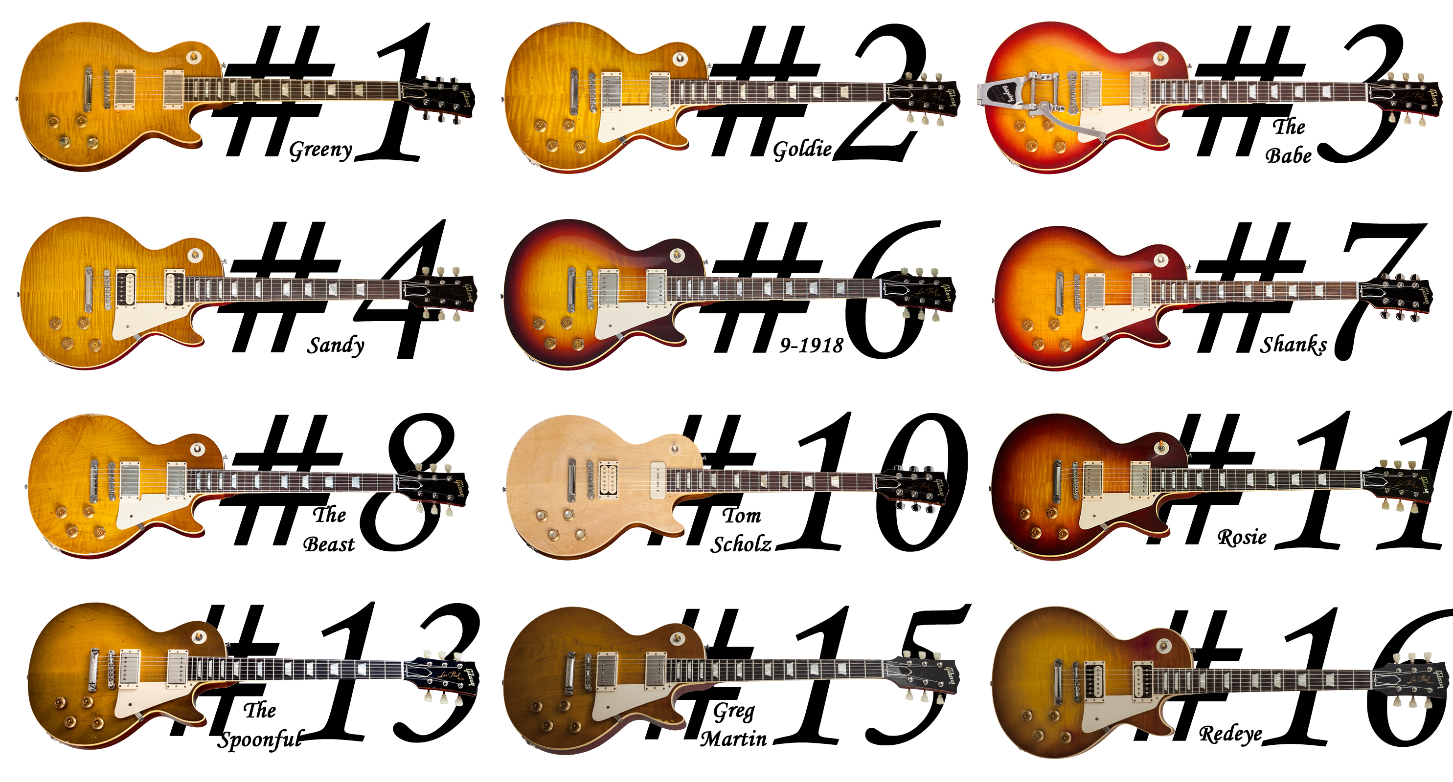 MAJ au 9 novembre 2013 : Collector Choice #13 1959 Les Paul Gordon Kennedy "Spoonful Burst" annoncée, #15 et #16 également... Ajout de la #16 (les autres n'étant pas dispo sur le site Gibson). Ajout de l'interview de Marsden au sujet de la #8. Ajout de la photo d'ensemble. Merci à No One !