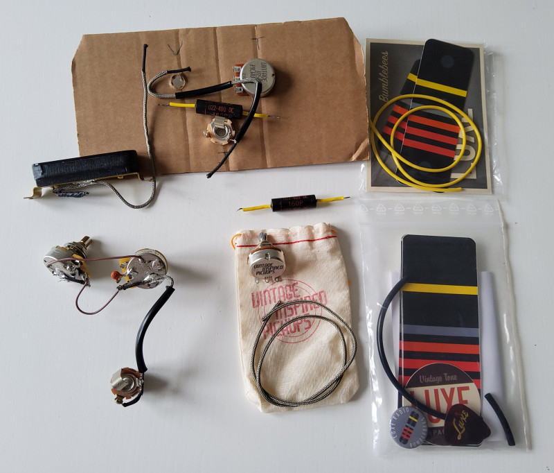 Ayant pour habitude d’en commander toujours un peu plus, je vais avoir de quoi faire un deuxième câblage identique: VIP Pots audio taper 280k volume, 550k tone, Luxe Black Beauty .022, gaines Luxe, câble tissu avec tresse blindée, jack switchcraft.