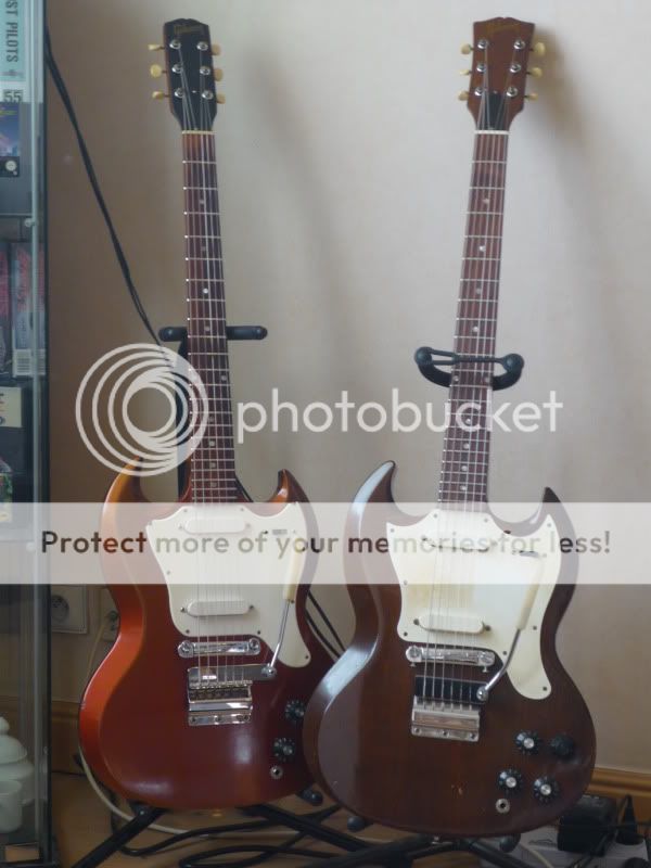 J'en ai une de fin 1969 (en finition Walnut, pas trop ma couleur préférée mais la guitare sonne, donc je m'en tappe) et une de 1967 (en Sparkling Burgundy, une custom color de chez Gibson qui est proche du CAR de chez Fender). La couleur de la 67 est devenue pas mal "faded" avec le temps. Certaines zones de la guitare sont maintenant "copper".