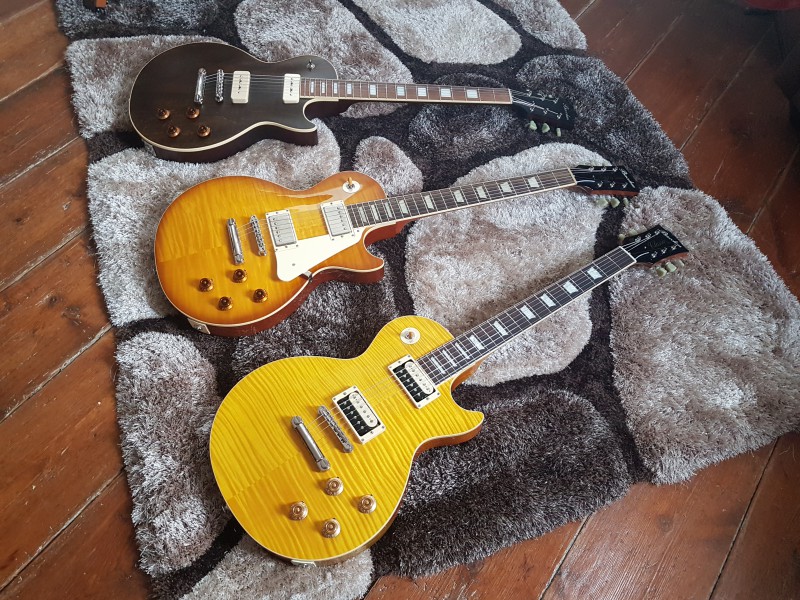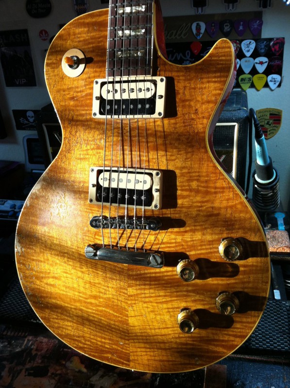 Puis en Slash je suis servi... l'Anaconda VOS et la Goldtop et la Table de ma Standard Trans Amber qui ressemble plus à Derrig qui rappelons-le n'est pas une flamed mais plus un birdseyes. Je lui colle mes APH2 et des reflector.