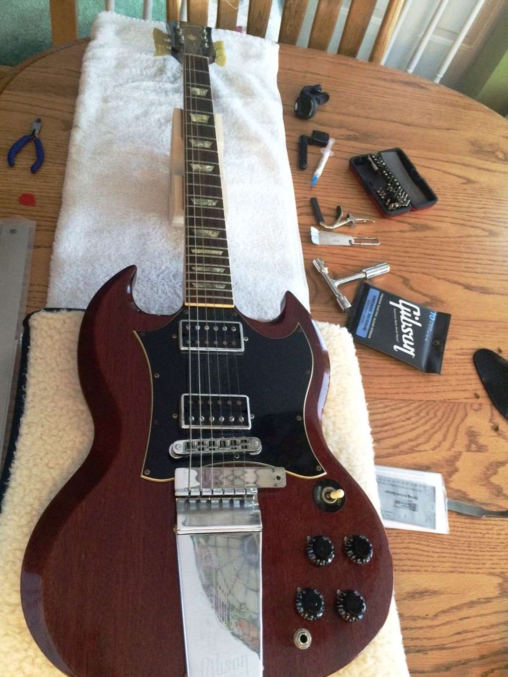 J' ai recu quelques pièces pour remettre à niveau la SG Special Faded ... ouf! Boutons de potards, pointeurs, TRC SG, boutons de strap, condos PIO soviétiques, visserie, etc...
