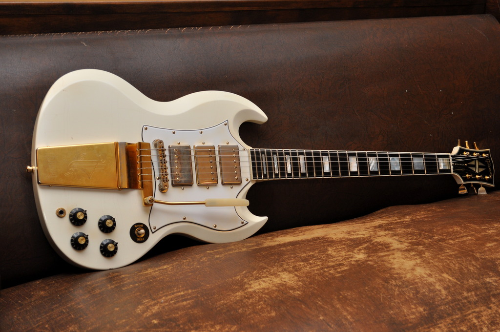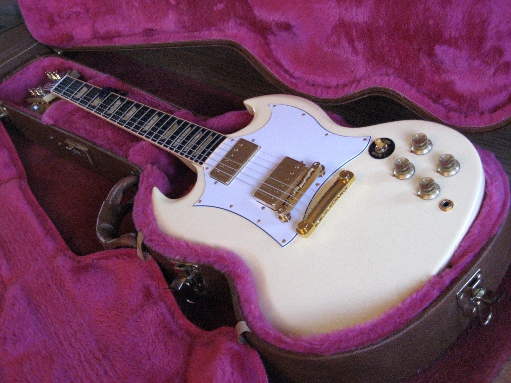 Cette SG est craquante mais je ne connais pas ce modèle, on dirait une '61 RI customisée. Elle n' est pas taillée comme une '68 ou '69