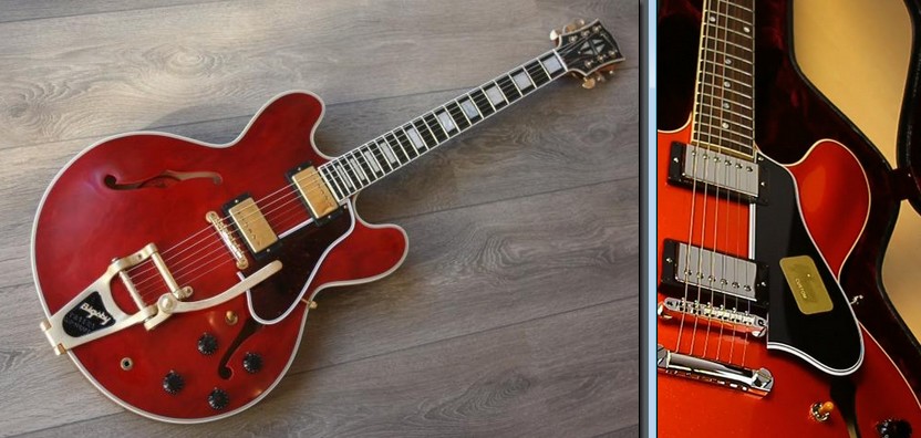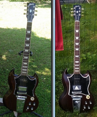 En fait j'ai juste rajouté une ligne blanche si tu veux avec du canson assez épais calé sous le pickguard ( et peint les vis noir aussi concernant la sg marron ).