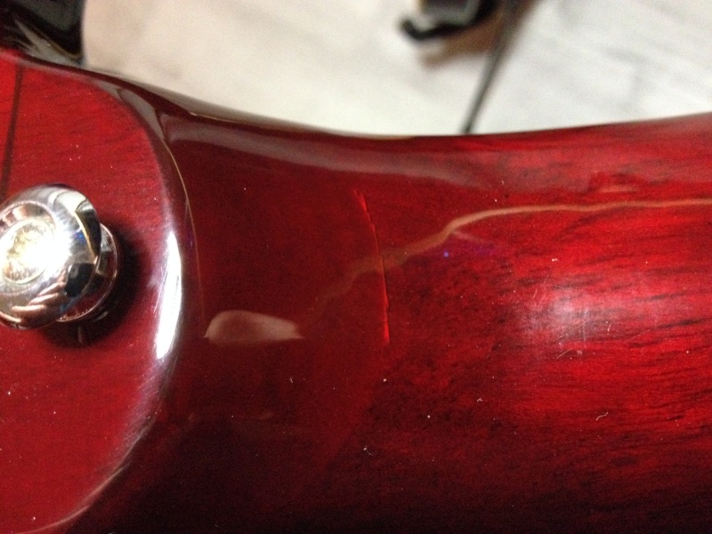 Sur celle ci on distingue une petite fissure sous le vernis au niveau du raccord du talon et du manche, cela n'as pas l'air méchant: