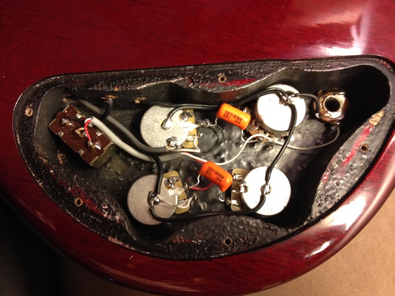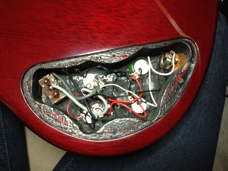 L'électronique, le micros manche ne fonctionnait pas lorsque je l'ai éssayé et ca crachait un peu au niveau potards, j'ai refait tous ca en rêgle facon "vintage":