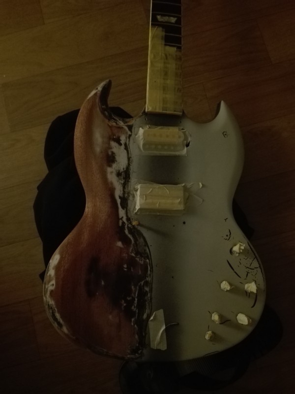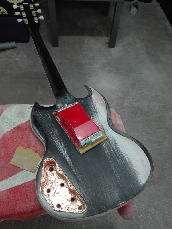 Bouchage des trous du vibrola , retravail des chanfreins, bouche porage , apprêt, bouche porage , ponçage , apprêt peinture etc....