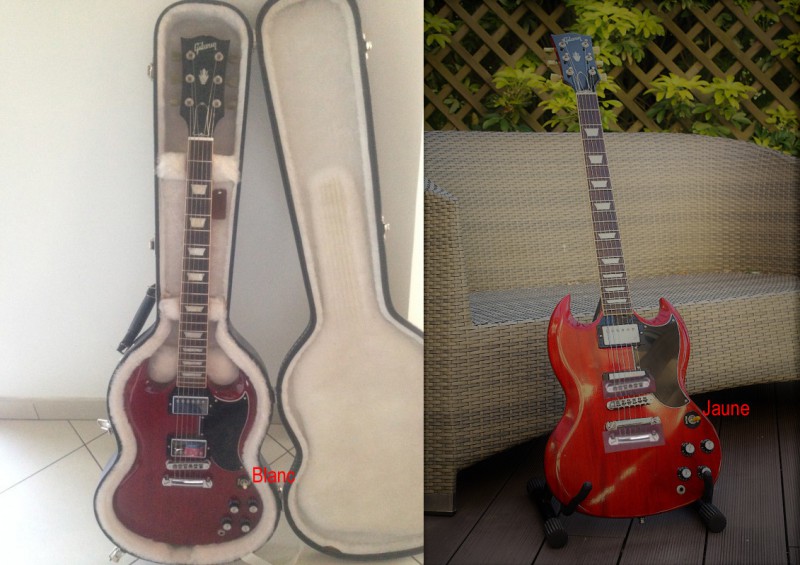 Donc la photo de gauche, c'est une des photos de l'annonce du Bon Coin, avant que j'achète cette guitare, et celle de droite, je l'ai prise hier dans mon jardin .