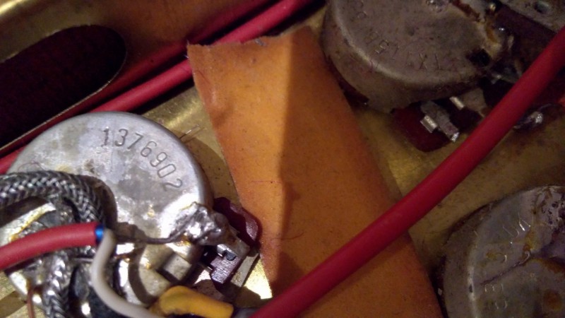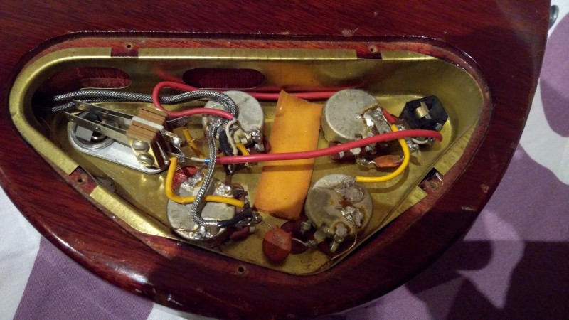 L'électronique est d'origine mais une "rallonge" a été soudée sur le potar de tone du micro manche pour raccorder le condo à la masse :