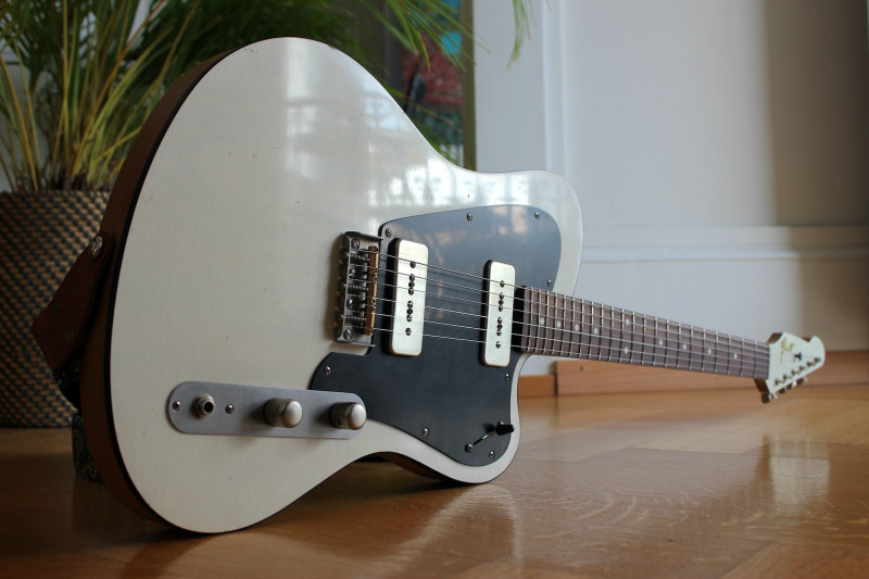 Oui, j’ai laissé tomber la plaque et la teinte orange sur conseil de Tony qui la trouvait vraiment belle au naturel. Avec les trois micros et le chevalet Stetsbar, ça forme une travée en métal qui se suffit à elle-même. Une plaque aurait été de trop. Quant à la teinte, c’est vrai que j’ai longtemps hésité mais elle est vraiment jolie comme ça et sur scène on la voit bien, elle n’a pas besoin de couleur. Ça fait une guitare sobre, classe et intemporelle, comme les autres Girault en fait. Bon j’avoue que le orange Gretsch me fait toujours craquer… mais je l’aime beaucoup comme ça, on voit mieux le bois et je me serais peut-être lassé du orange…