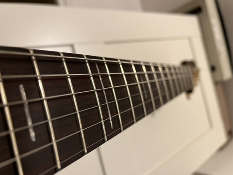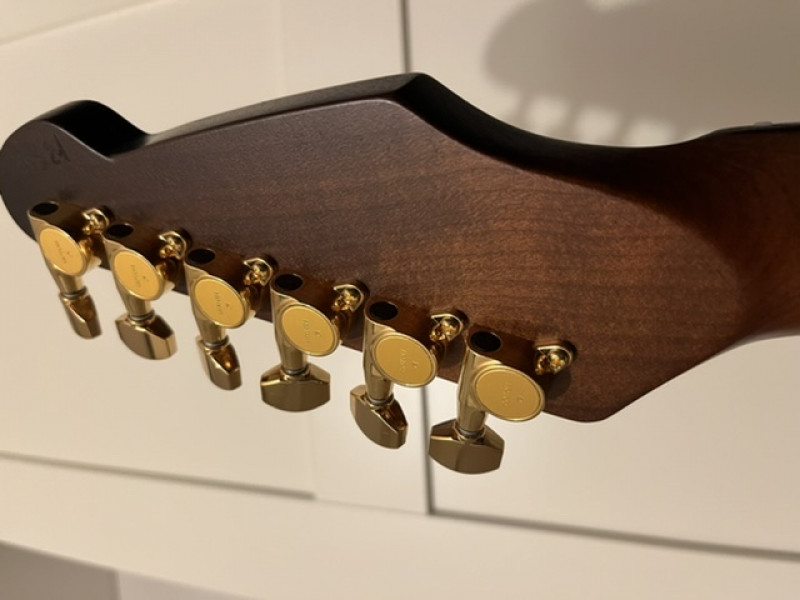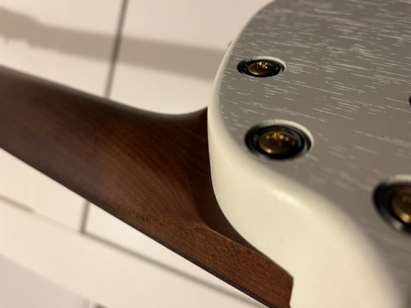 Un autre truc sur lequel j’ai laissé toute latitude à Tony : le manche. Je savais de source sûre que Tony faisait l’un des meilleurs manches du marché et j’ai préféré sciemment ne lui donner aucune indication parce que je n’aurais pas su trop quoi demander. Eh bien j’ai bien fait : le manche est génial. Suffisamment rond et épais, il tient bien dans la main ; pas trop large, je passe facilement le pouce par-dessus et je suis confortable en barrés, en accords hendrixiens et en solo. Le bonheur total ! Et la finition huilée satinée est top !