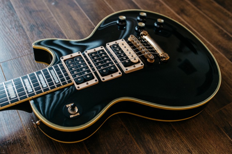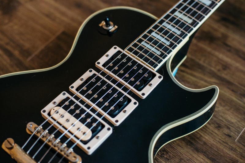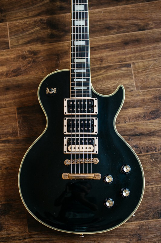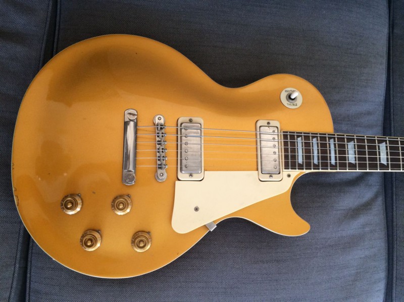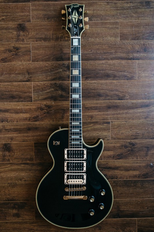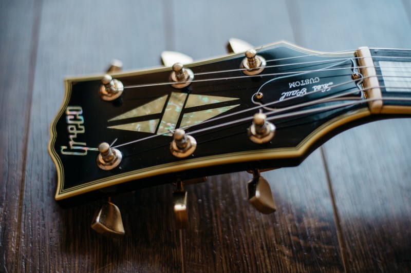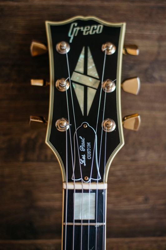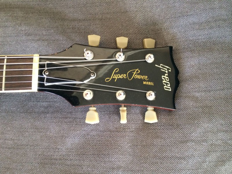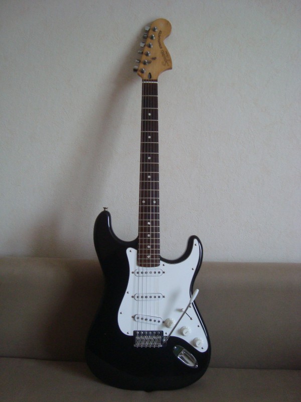 Le corps est celui d'une Greco de 1981, le manche ayant été cassé par le premier propriétaire, il a été changé par un manche Squier dont j'ignore la date de production. Ceci dit celui-ci me tombe plutôt bien en main. Le radius semble être un 9,5" ce qui est loin de ce que j'aime habituellement et pourtant je m'y sens assez à l'aise. Le frettes sont des jumbo vintage donc très petites par rapport à mes habitudes. C'est plus sur ce point que ça me gène. Dès que possible je les ferai changer pour des 6100. Le sélecteur est un trois positions que je changerai lui aussi très probablement. Les mécaniques de tête sont de bonne qualité mais je les changerai sans doute aussi en dernier lieu car ce type de fixation de corde ne me convient pas. J'opterai pour du vintage style Kluson ou par des mécaniques à blocage qui sait. Le vibrato est actuellement réglé en flottant ce que je modifierai car j'aime celui-ci posé sur la table. Je l'utilise assez peu et un usage en poussé me convient. Je pense que je changerai aussi le vibrato d'origine car apparemment il serait en zamak. Sur la tête style tête CBS les logos semblent conformes mais en bout de tête on aurait effacé l'inscription "original contour body". Côté micro et électronique c'est entièrement original. Actuellement montée avec un tirant plutôt léger, elle sera à terme montée en 11/49. Elle sonne radicalement différent de mes deux autres Stratocasters.