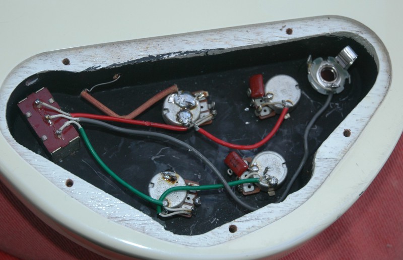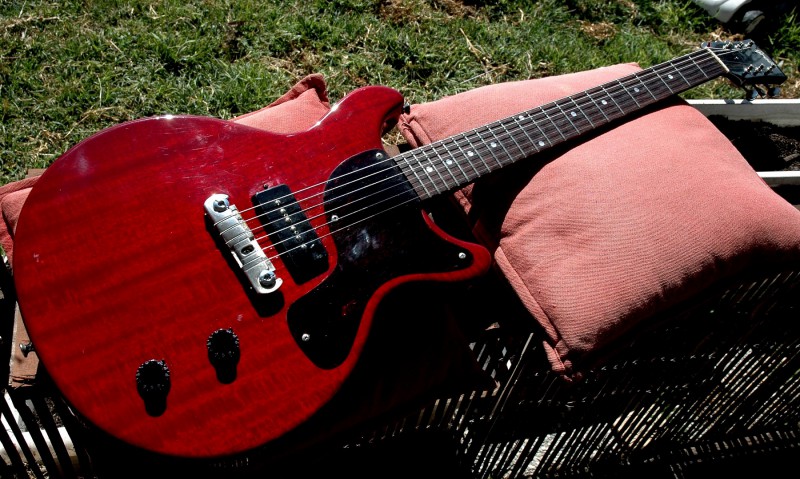 Bon il fait un temps de merde, mais j'ai quand même fait une petite photo de la SG. Les micros d'origine n'étaient pas trop mal, mais j'avais prévu d'installer au plus vite un Manlius T-Top que j'avais en stock et qu'il me tardait d'essayer. Alors je ne suis pas un spécialiste des T-Top, j'ai eu un set daté d'environ 1975 que j'aurais peut-être dû garder, j'ai eu aussi un set Hysteric doubles brunettes qui sont, sauf erreur, des répliques de T-Top, mais que j'ai aussi revendu, il aurait fallu pouvoir comparer ces micros au même moment sur la même guitare pour en parler un peu mieux, mais le Manlius est absolument génial, en tout cas sur cette guitare. Je ne savais pas trop quoi monter en manche, j'ai essayé un Duncan Antiquity, c'était trop rond, trop doux, et finalement, j'ai monté un P90 format HB SP Custom et c'est la bonne pioche, excellent complément au T-Top replica.
