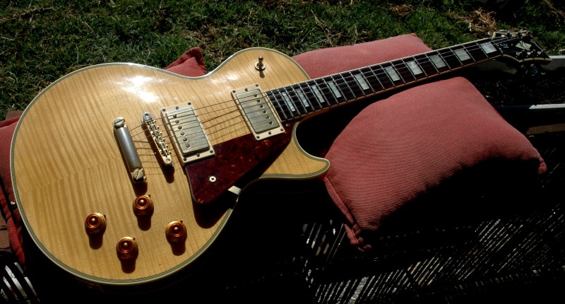 J'ai quelques doutes sur le fait que cette Greco soit une MIJ. Pour commencer, l'angle de renversement du manche est bien plus faible que sur une SG "normale" et pour avoir une action basse, le chevalet doit être baissé au maximum. Je m'étonne donc d'une telle approximation de construction de la part de Greco, qui a montré son savoir-faire dans la réplique exacte. Le chevalet est bien du type ABR1, avec les vis directement fixées dans le bois de la caisse, mais l'électronique et certains détails, comme le gros sillet et le "Greco" sur la tête me font penser à une fabrication déjà délocalisée en Corée. La guitare date théoriquement de 1989, mais il n'y a pas de n° de série. J'ai vu dans les diverses petites annonces des SS63-60 de cette année, parfois avec un n° de série, parfois sans n° de série, aussi je ne sais pas trop quoi penser. Ca ne m'empêchera pas de dormir : je ne l'ai pas payée cher, elle sonne très bien et le manche est excellent. Je me serais attendu à un slim taper sur une SG, c'est plutôt un rounded 59.
