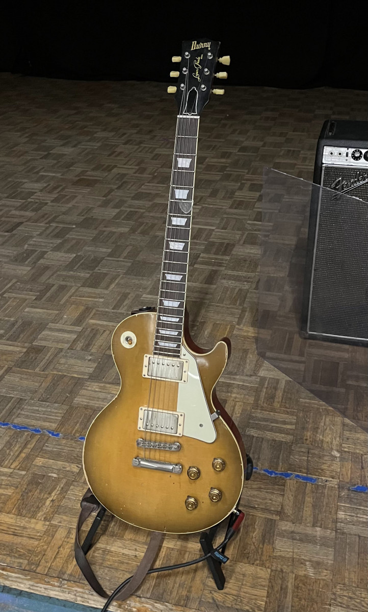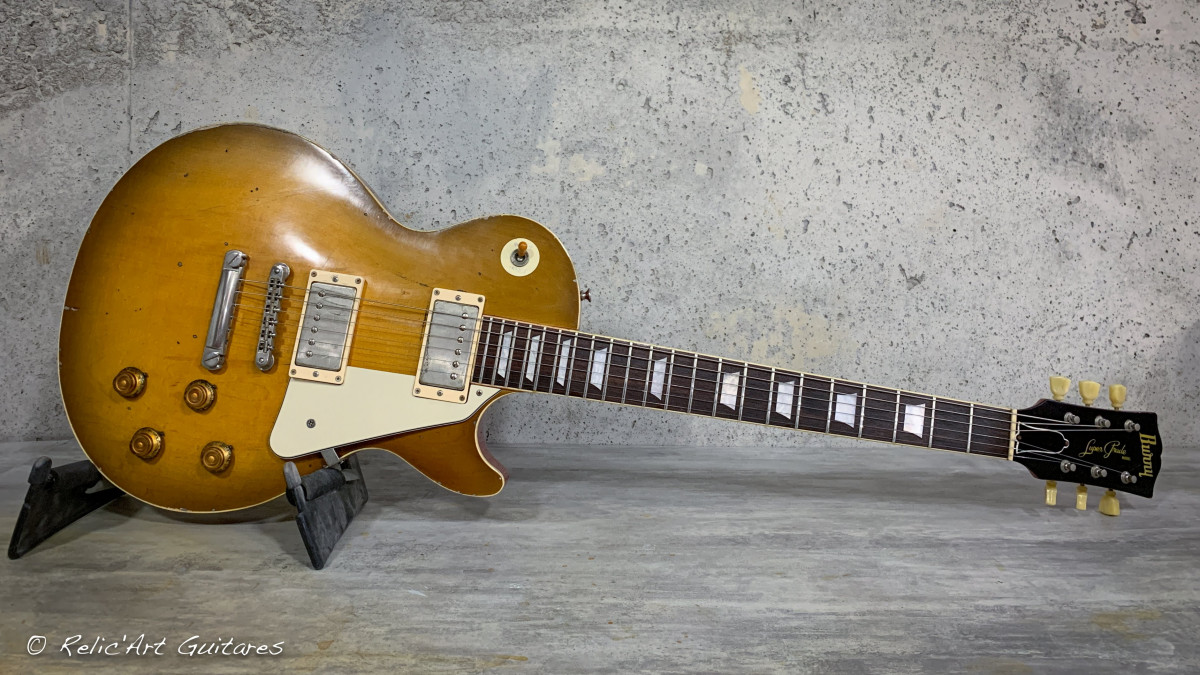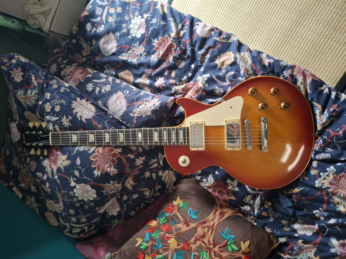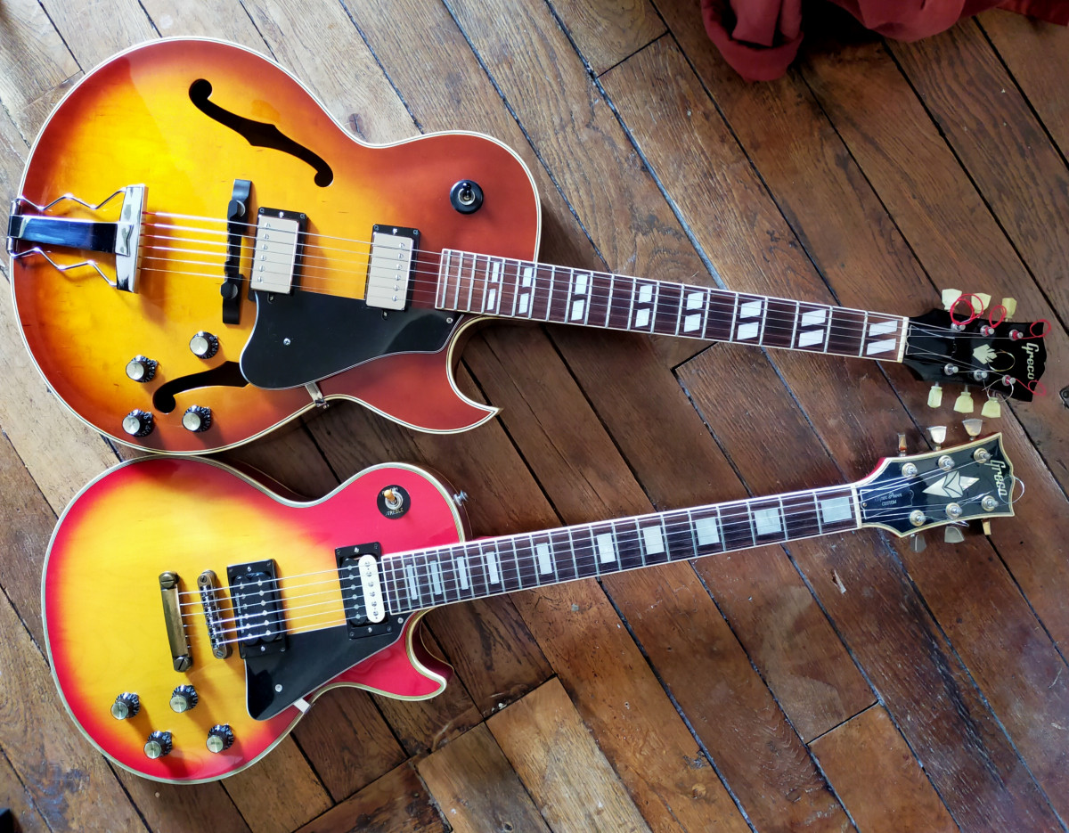 Je l’ai achetée d’occasion sans pickguard avec le vernis totalement détérioré par un produit abrasif. Le vernis nitro a été enlevé delicatement, retiré et refait puis patiné par AF guitare à Ermont, Val d’Oise. Il a aussi repris le binding qui s’enlevait par endroits. Bref un gros travail qui donne un cachet très joli à cette guitare. Sinon, elle est totalement d’origine : mecaniques, chevalet electronique et micros. Pas besoin de changer quoi que ce soit. Elle est tres agréable à jouer, tres légère (3,3 kg) et elle sonne !