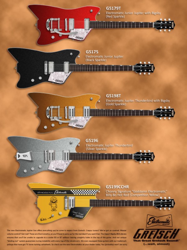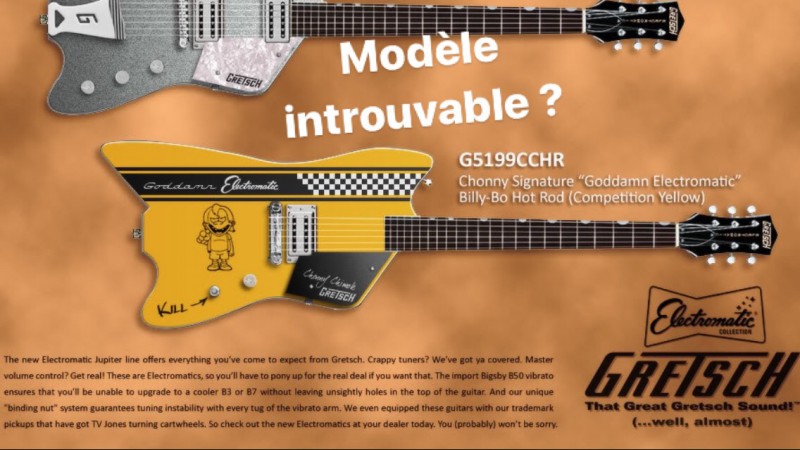 Je recherche depuis longtemps cette guitare à propos de laquelle Gretsch a apparemment fait de la publicité. Impossible de la trouver. Comment puis-je faire ? Existe-t-elle vraiment ? Quelqu’un peut-il m’éclairer. Au catalogue seule la G6199 (classique si je puis dire !) y figure. Merci pour vos lumières... Doc Loco peut-être ??...