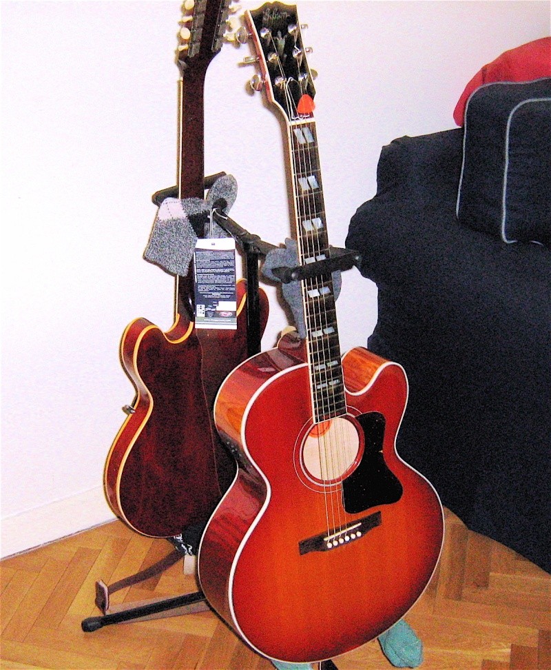 Ici, ma Blues King Electro à pan coupé tient compagnie à la 335/12 sur le stand, dans mon ancien chez moi. J'adore le dos bombé qui rappelle les guitares jazz de la marque, à l'inverse des dreadnought dont le dos est aussi plat que la table.