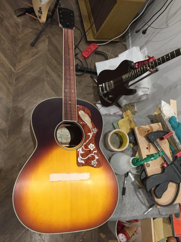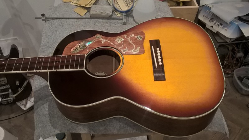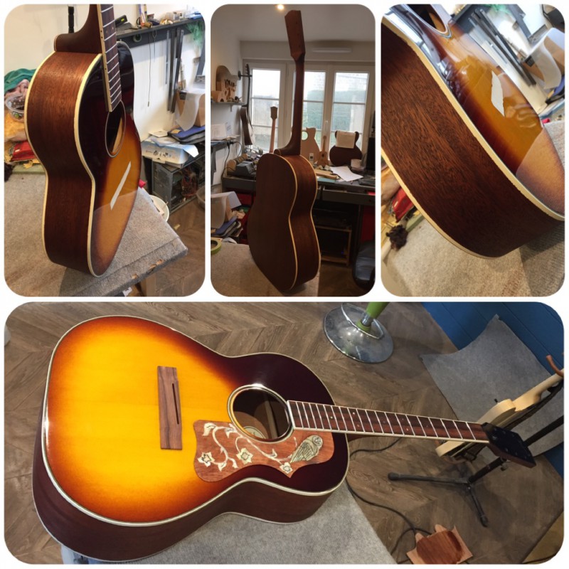 Si jamais vous avez un avis il est encore temps, bientôt, la guitare sera polie, le pickguard vernis puis collé, la touche huilée, puis les frettes, le chevalet.... je ne sais quoi encore ( ah oui, teinture dos et éclisses