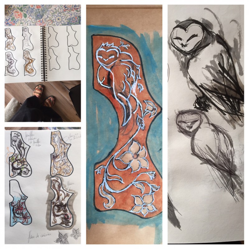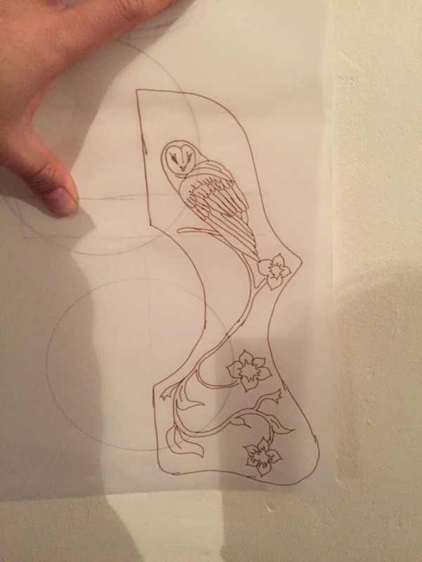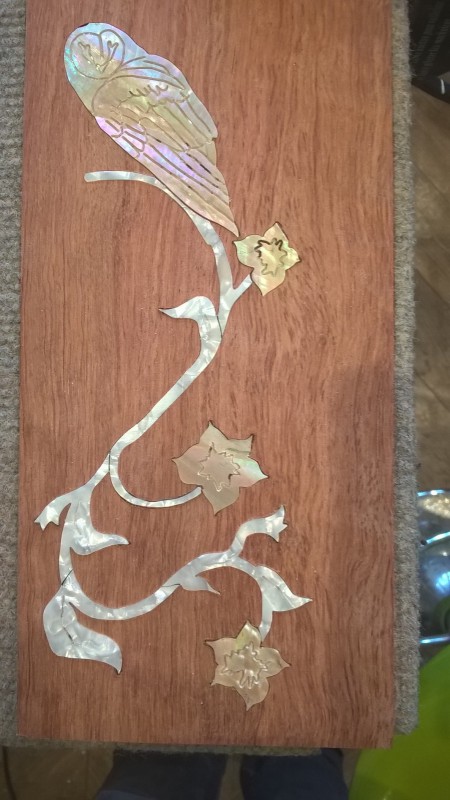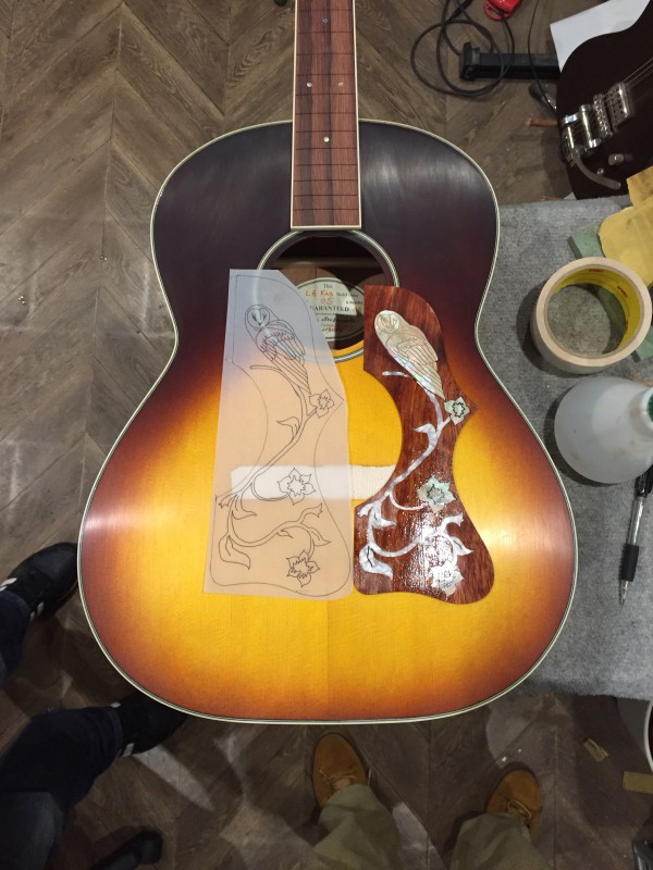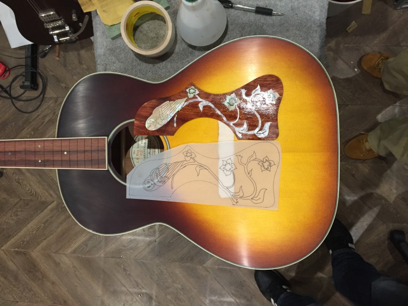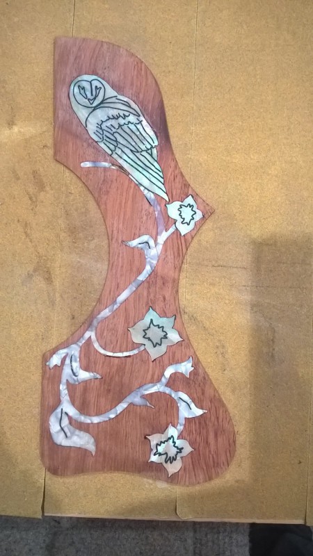 Je suis passé au moins trois fois chez stefanovic la semaine dernière, beaucoup d' essais, de doutes, le choix des nacres ( fallait-il en commander d' autres ou non ? Vert, jaune, blanche, laquelle choisir ? ) j' avoue que je débarquais en territoire inconnu, beaucoup d' hésitation et puis voilà, c'est presque bouclé pour le pickguard