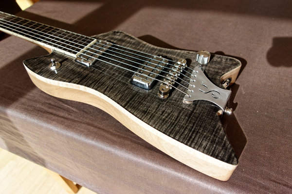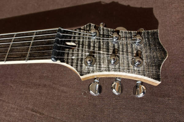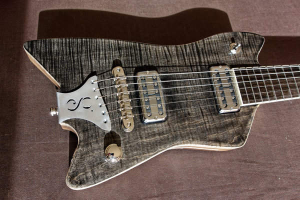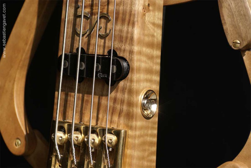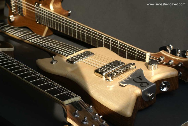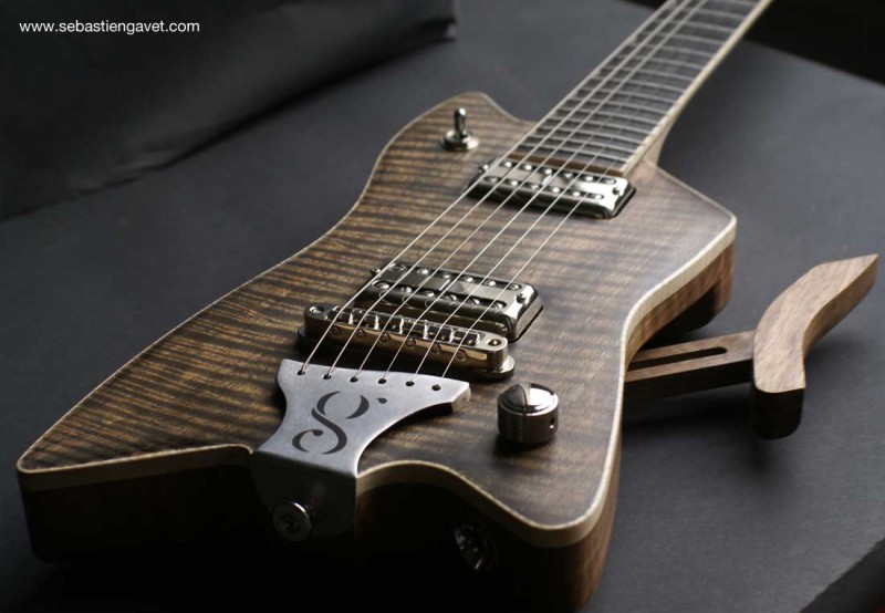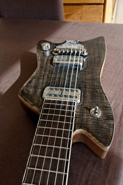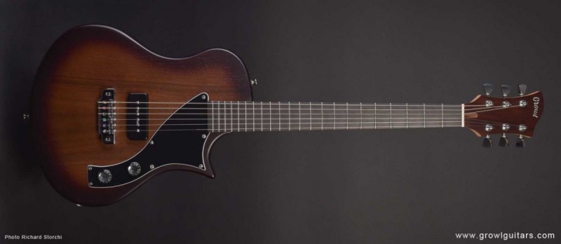 , ce modèle a un corps en noyer français, un manche collé en érable ondé du jura et une touche en ébène. L'accastillage chromé est de marque Gotoh et le micro un P90 Growl, un volume et une tone. Vernis cellulo mat, 22 cases et diapason 25' avec radius compensé. J'ai un modèle comme celui-ci disponible en ce moment sur Paris pour ceux qui souhaiterait l'essayer. Les samples devraient également bientôt arriver. Elle était également en test dans le GuitarPart de juillet-aout dernier avec un chouette article. Pour le prix, elle est à 1780€ en version 1 micro et à 1950 € en version 2 micros.