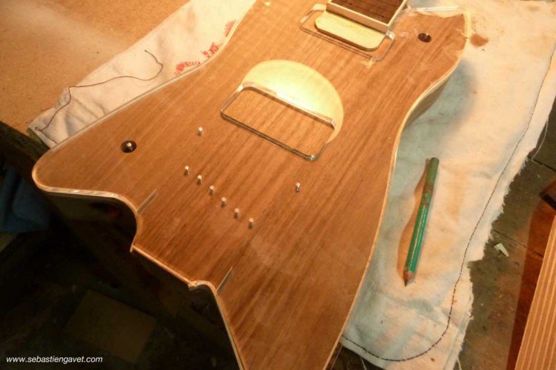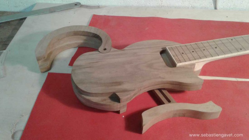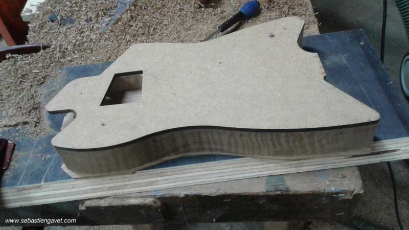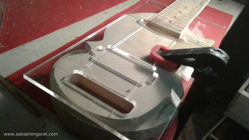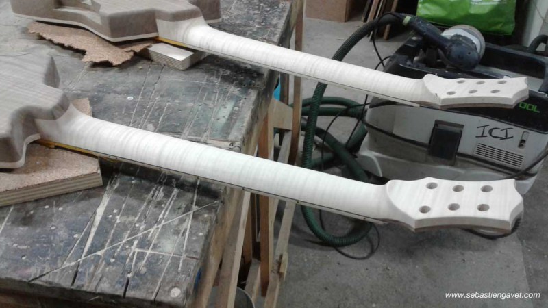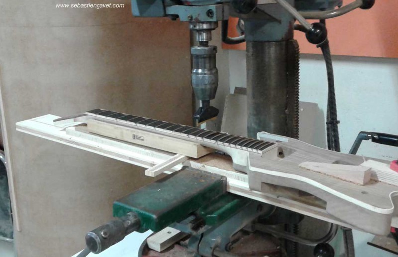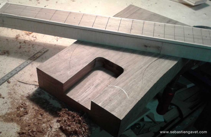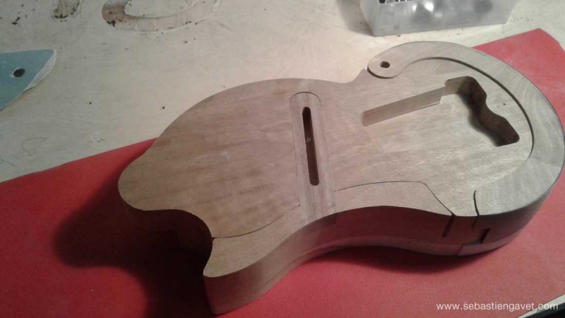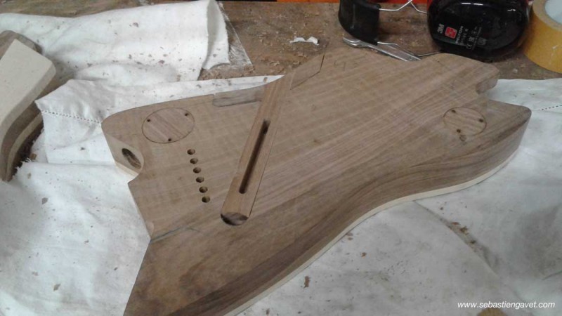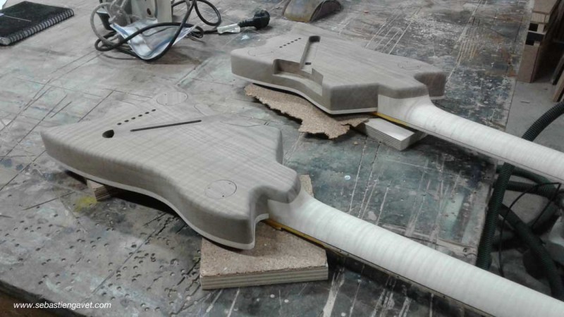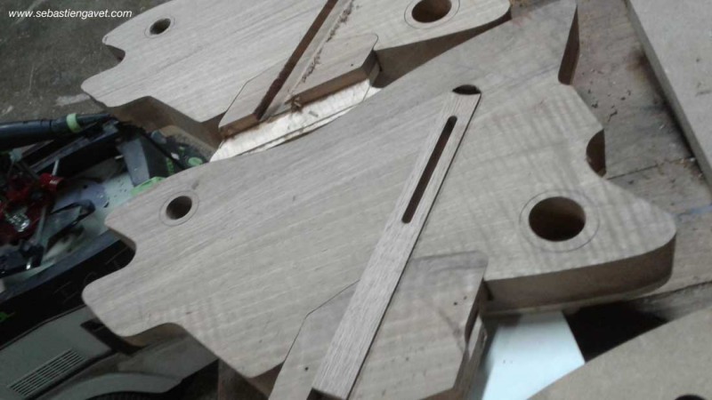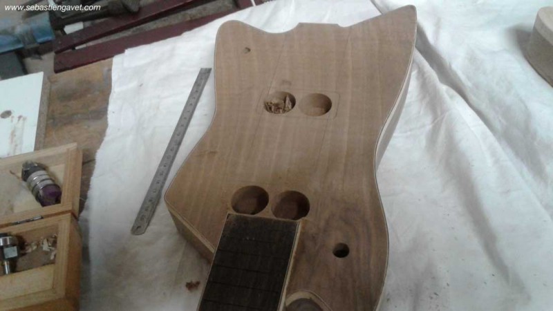 --Différents perçages et défonces pour la tête de la guitare tour bus.